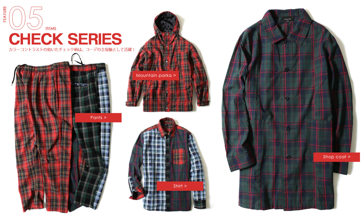 レッド、グリーンを基調としたベーシックなチェック柄以外にも、個性的なクレイジーチェック柄の3カラーをご用意。