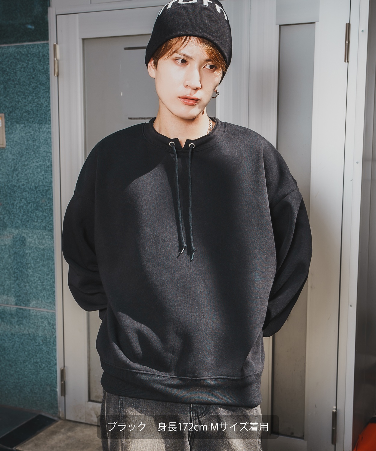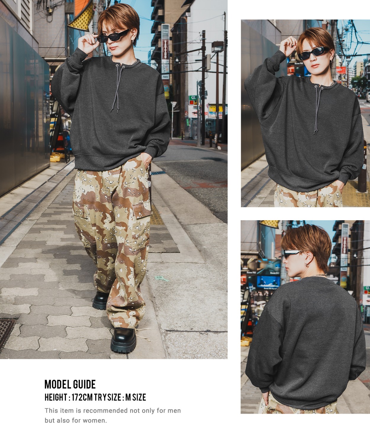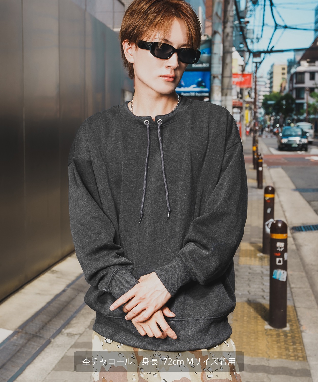 Attention ※ウエストにゴムが入ったパンツのウエスト値は、推奨ウエストのサイズです。伸縮値では御座いませんのでご注意下さい。 ※大量生産による生産過程におきまして、 若干の個体差(1cmから2cm)が生じる場合がございます。 それ以上の差異がある場合は弊社までお問い合わせください。 【サイズの測り方についての詳細はこちら】 ※サイトに掲載されている商品は、モニター環境により実際のものと素材感・色が若干異なって見える場合がございます。 ※加工具合により掲載画像との誤差が見られる場合もございます。 予めご了承くださいますようお願い申し上げます。 image ![]() ![]() ![]() ![]() ![]() ![]() ![]() ![]() ![]() ![]() ![]() ![]() ![]() ![]() コストパフォーマンスに優れた、ディティールが光るトレーナー。 ●保温性に優れ、毛布のような優しい肌触りの裏起毛素材 ●モックネックにドローコードを装着したディティール ●シルエットが光るドルマンスリーブ ●チャコール、グレーベージュといった定番カラーをセレクト ゆったりしたサイジングでメンズはもちろんレディースにもオススメのユニセックスな一枚。 首元のコードや、ドルマンスリーブが一枚でもキマる。 ワイドパンツやカーゴパンツと合わせてのストリート、韓国スタイルがオススメ。 ディティールが光る、ちょっと個性を出したいトレーナー