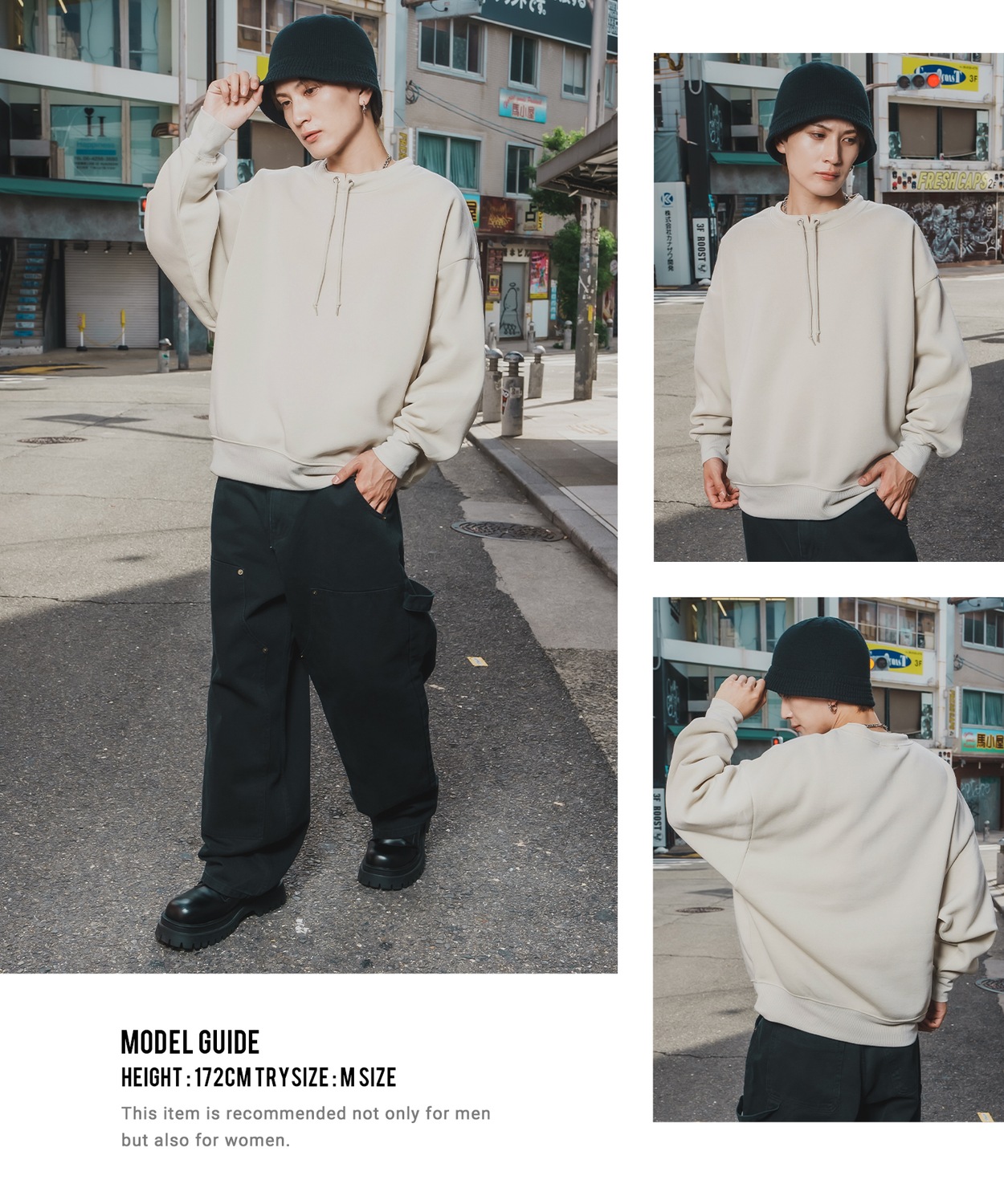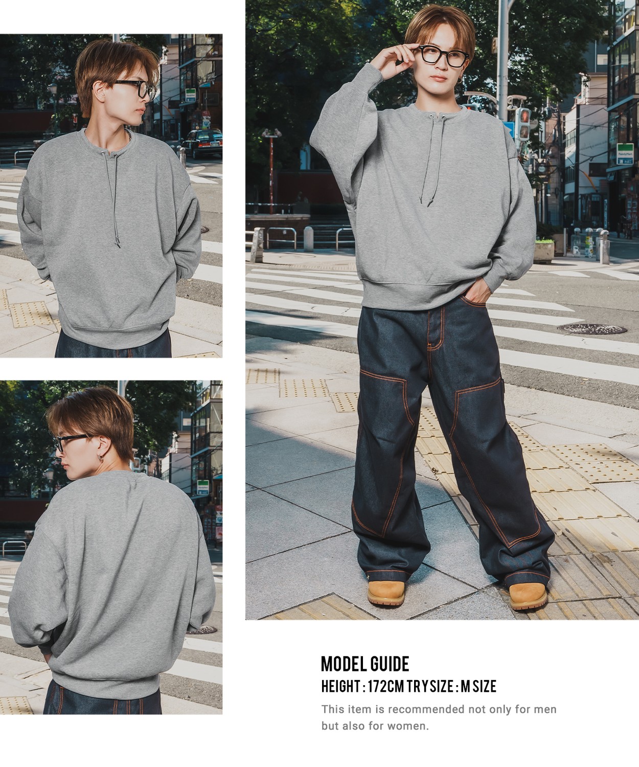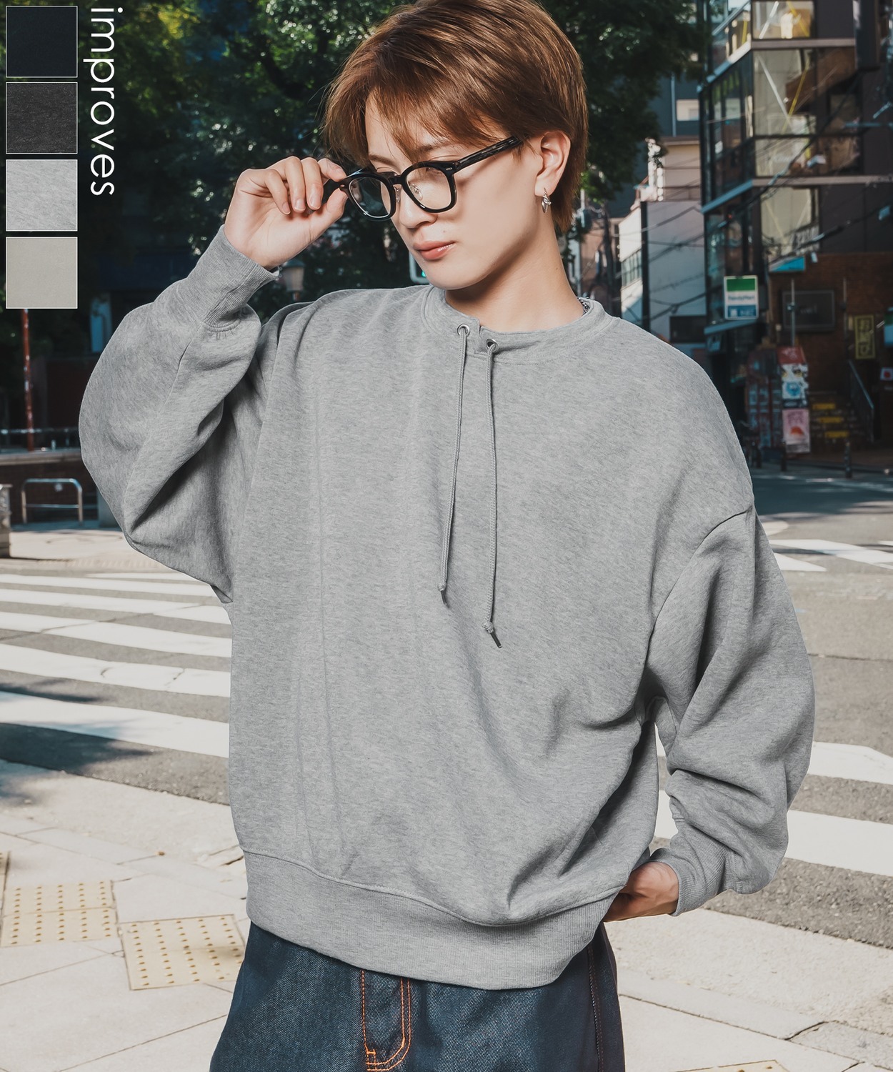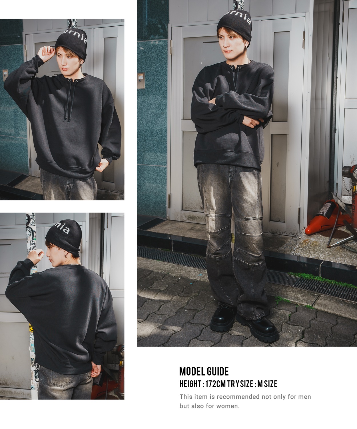 Attention ※ウエストにゴムが入ったパンツのウエスト値は、推奨ウエストのサイズです。伸縮値では御座いませんのでご注意下さい。 ※大量生産による生産過程におきまして、 若干の個体差(1cmから2cm)が生じる場合がございます。 それ以上の差異がある場合は弊社までお問い合わせください。 【サイズの測り方についての詳細はこちら】 ※サイトに掲載されている商品は、モニター環境により実際のものと素材感・色が若干異なって見える場合がございます。 ※加工具合により掲載画像との誤差が見られる場合もございます。 予めご了承くださいますようお願い申し上げます。 image ![]() ![]() ![]() ![]() ![]() ![]() ![]() ![]() ![]() ![]() ![]() ![]() ![]() ![]() コストパフォーマンスに優れた、ディティールが光るトレーナー。 ●保温性に優れ、毛布のような優しい肌触りの裏起毛素材 ●モックネックにドローコードを装着したディティール ●シルエットが光るドルマンスリーブ ●チャコール、グレーベージュといった定番カラーをセレクト ゆったりしたサイジングでメンズはもちろんレディースにもオススメのユニセックスな一枚。 首元のコードや、ドルマンスリーブが一枚でもキマる。 ワイドパンツやカーゴパンツと合わせてのストリート、韓国スタイルがオススメ。 ディティールが光る、ちょっと個性を出したいトレーナー