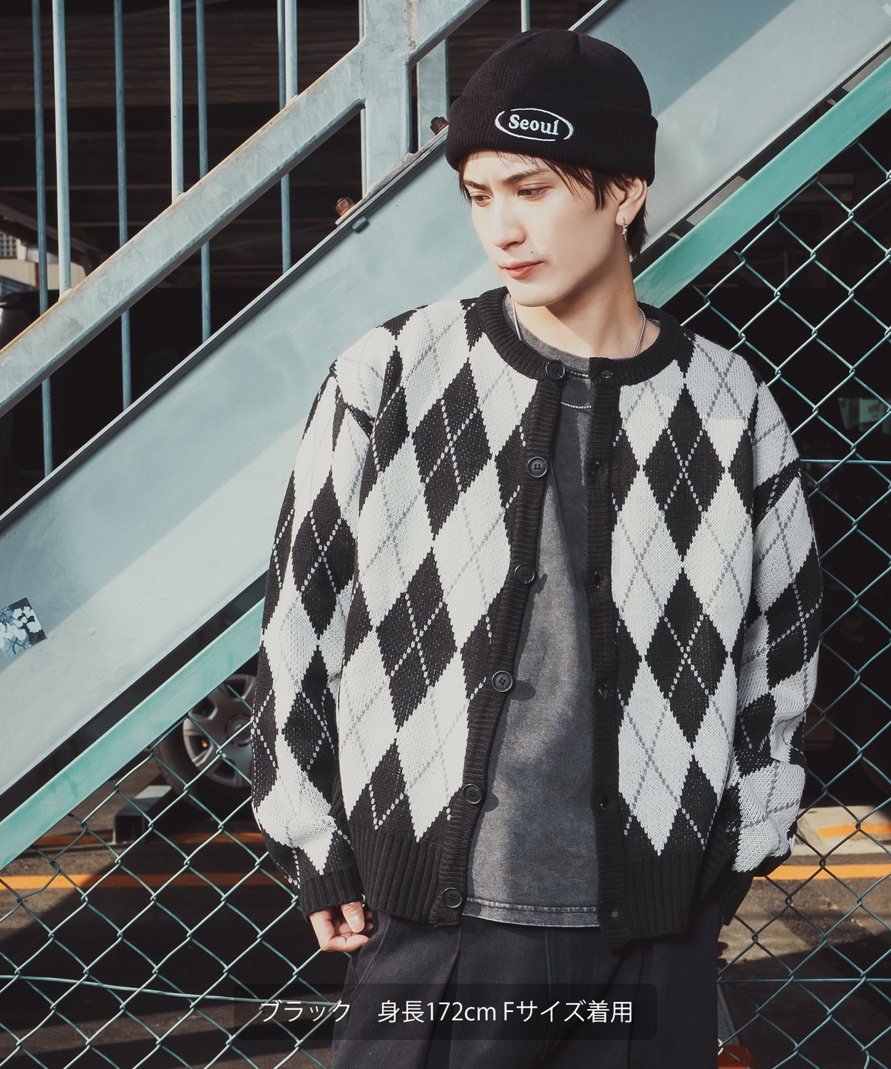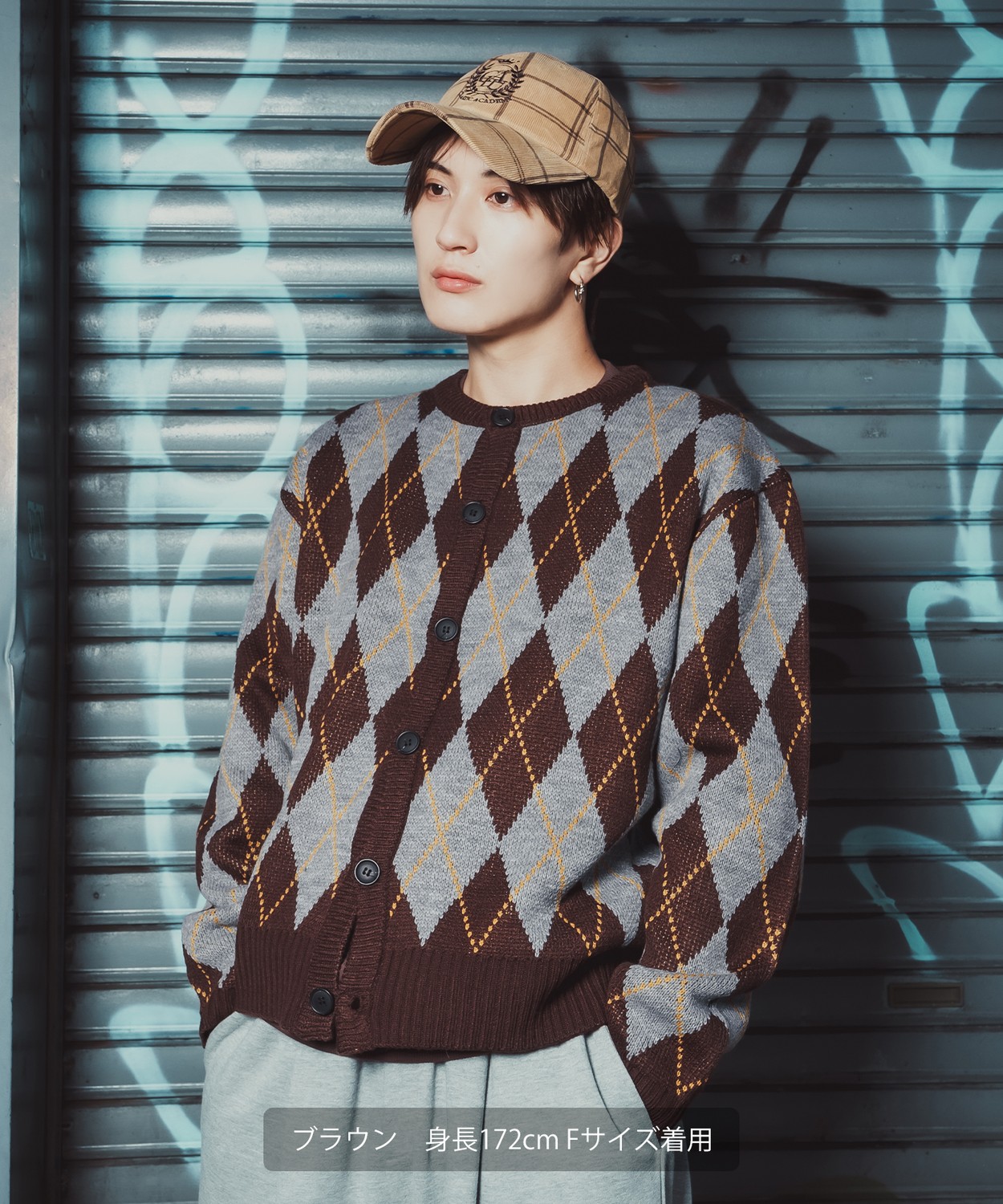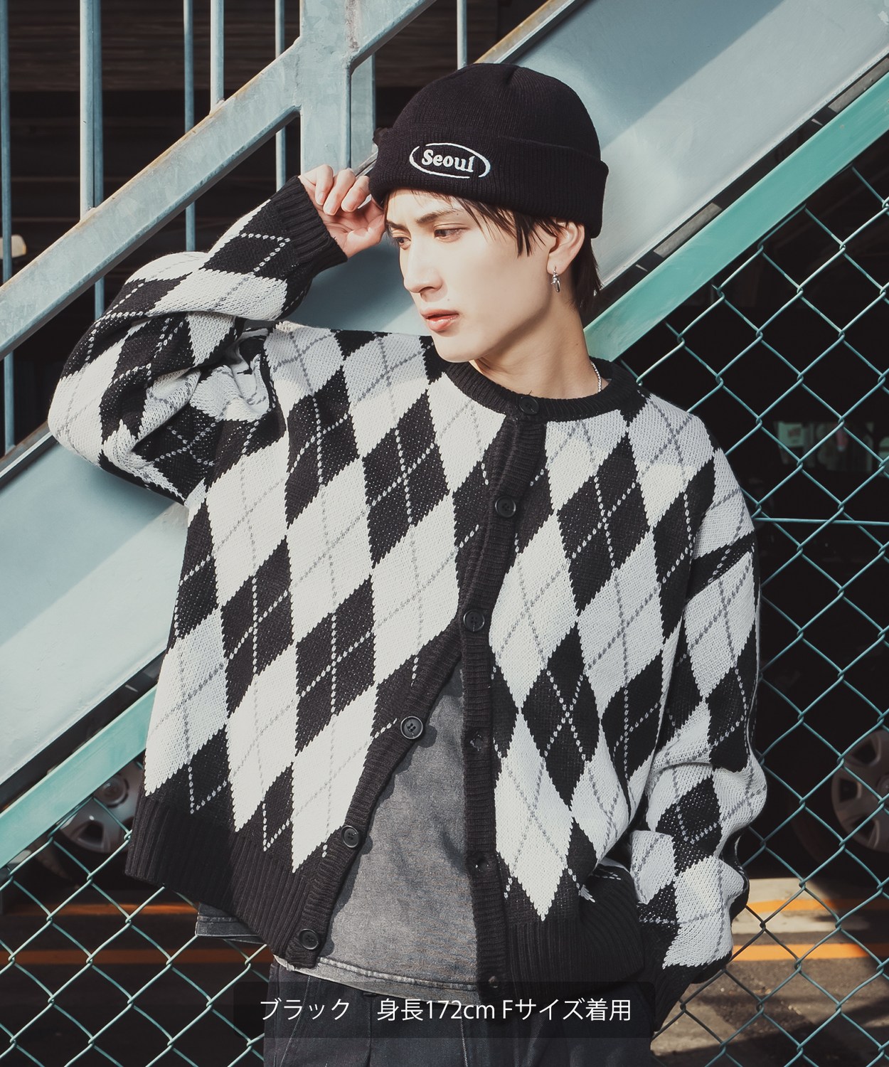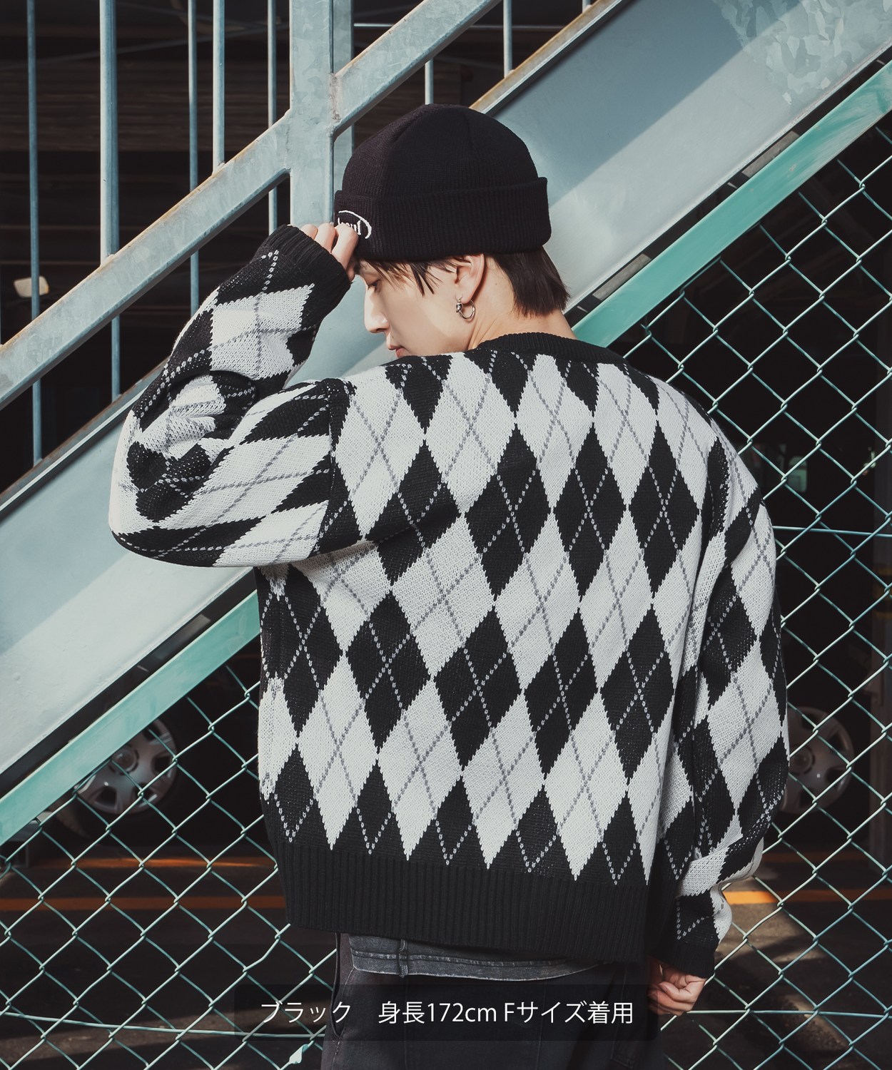 存在感抜群のビッグアーガイルで差をつける!旬のルーズシルエットとクラシックな総柄をミックスした主役級カーデ!