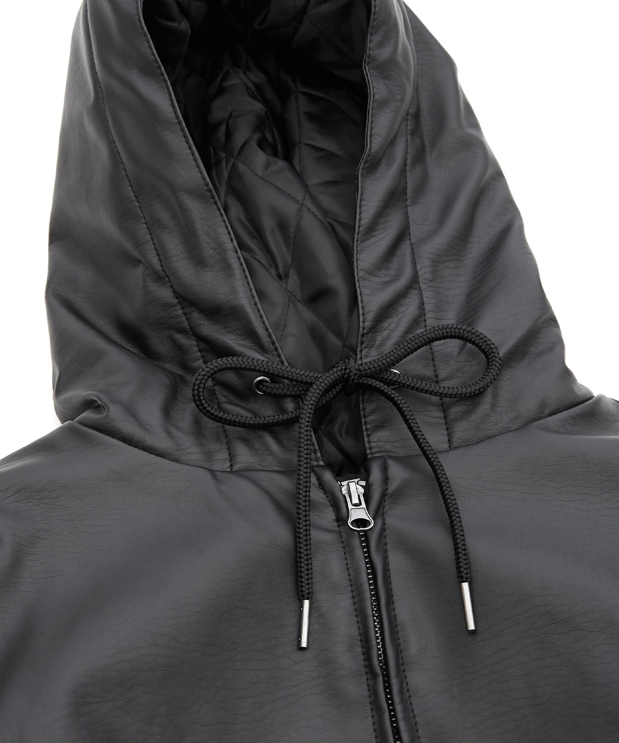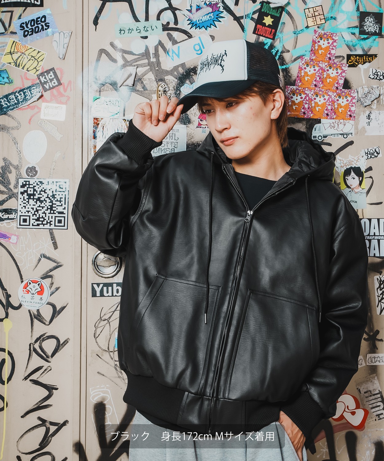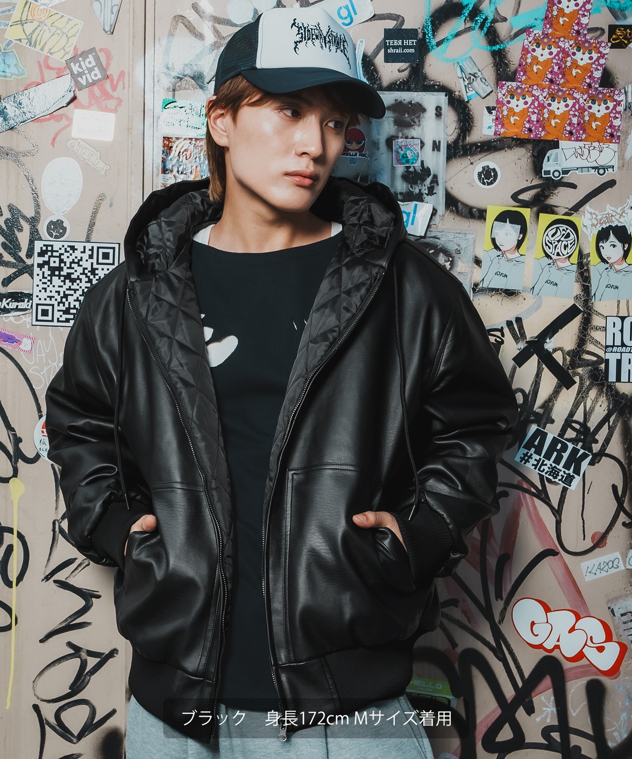ハードなレザーの質感とカジュアルなパーカースタイルを融合させた、ストリート感溢れるアウター。