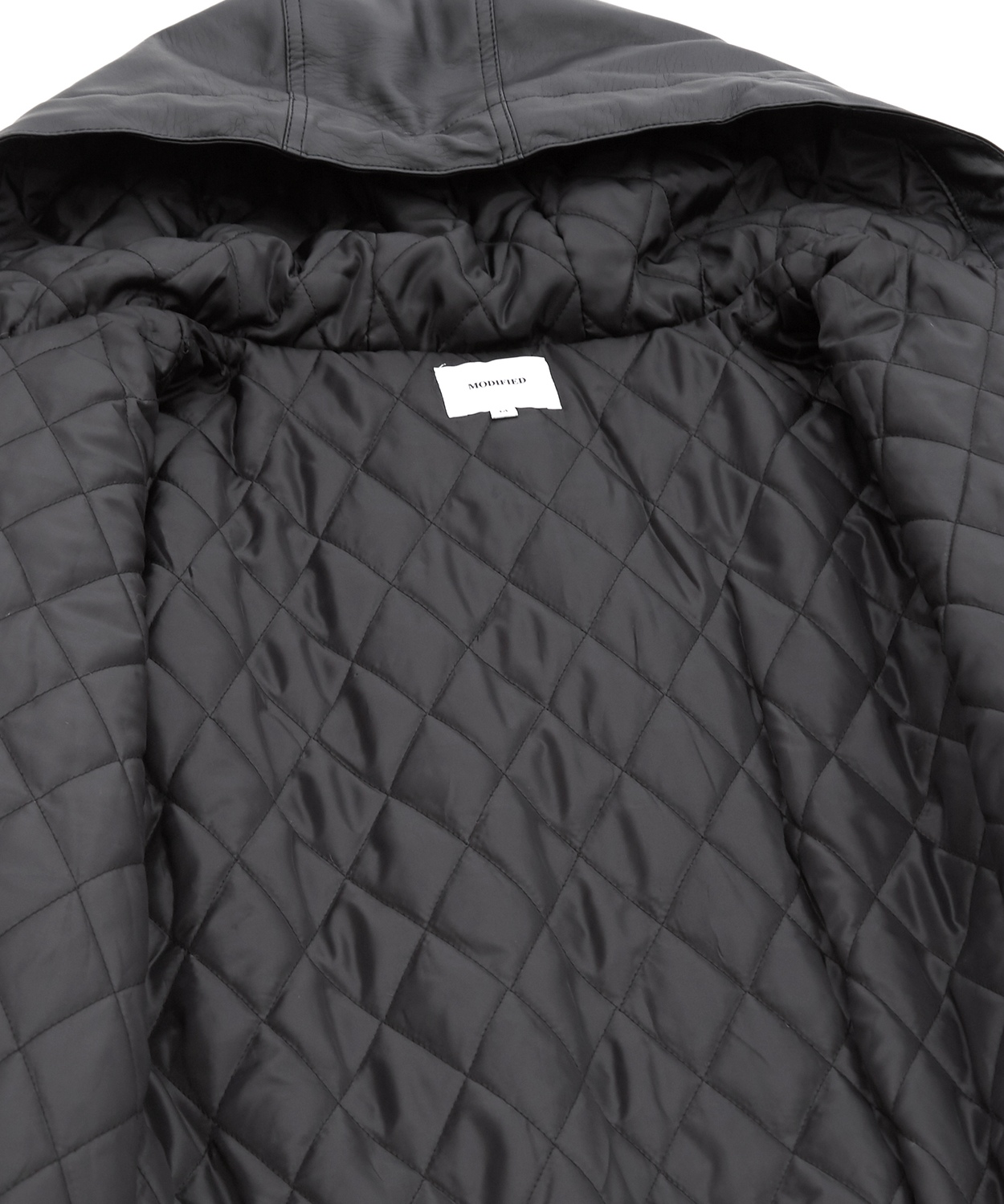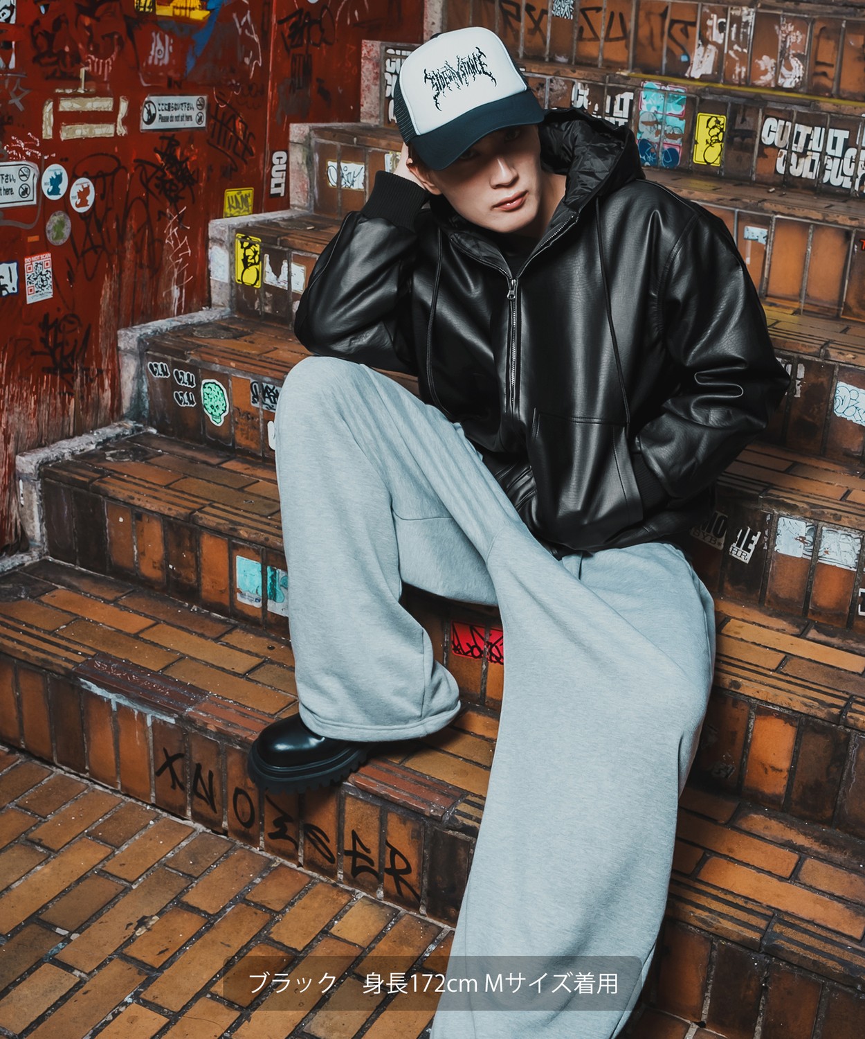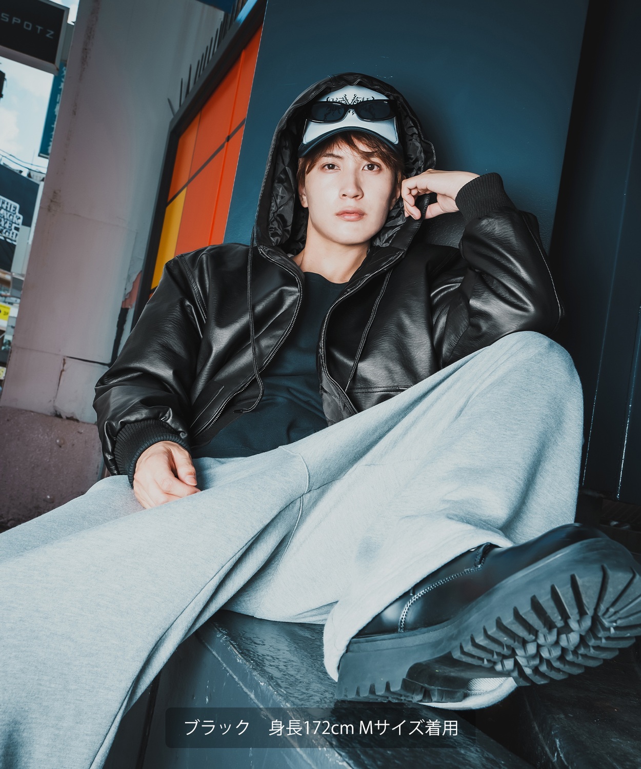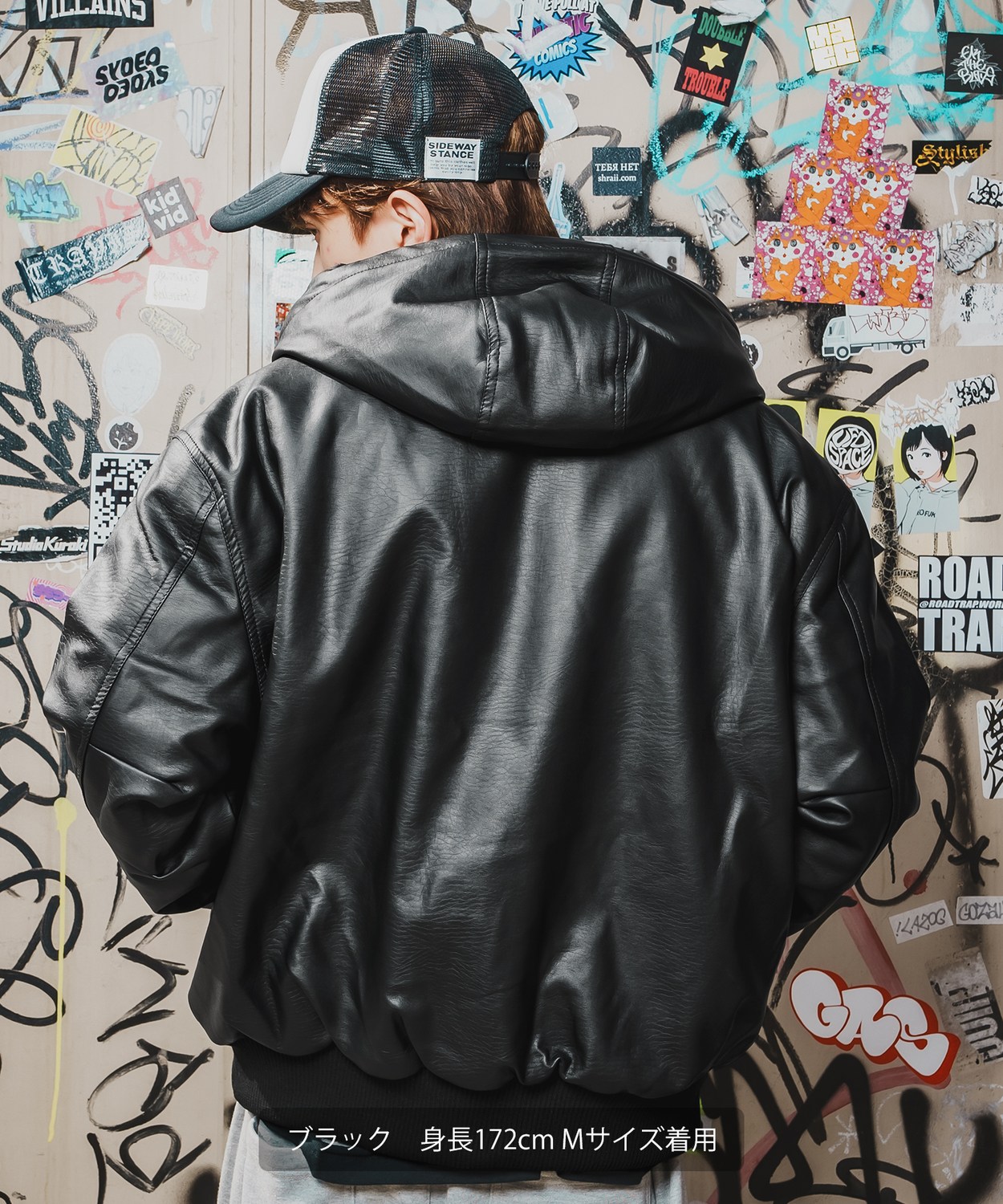 ハードなレザーの質感とカジュアルなパーカースタイルを融合させた、ストリート感溢れるアウター。