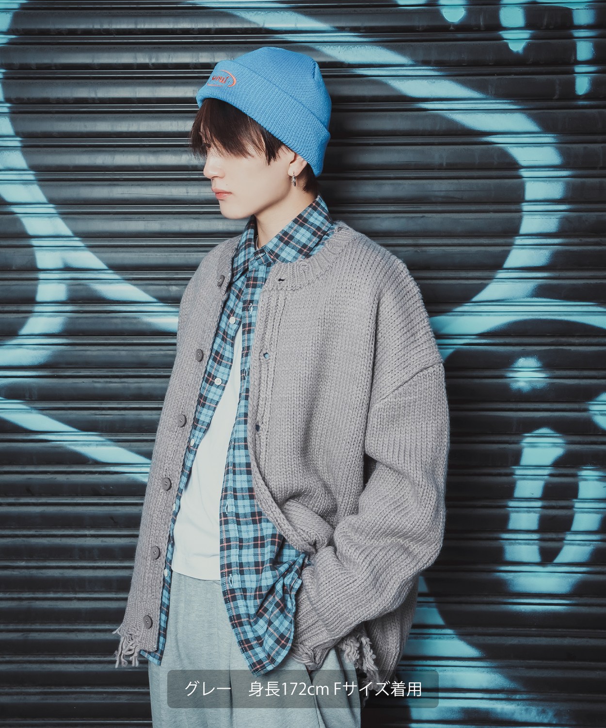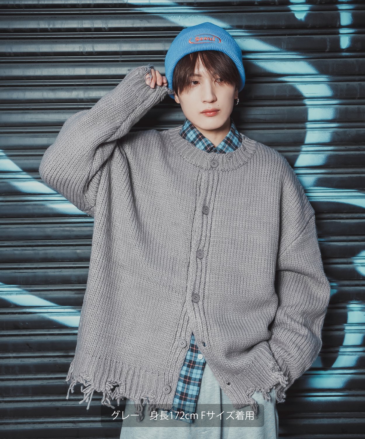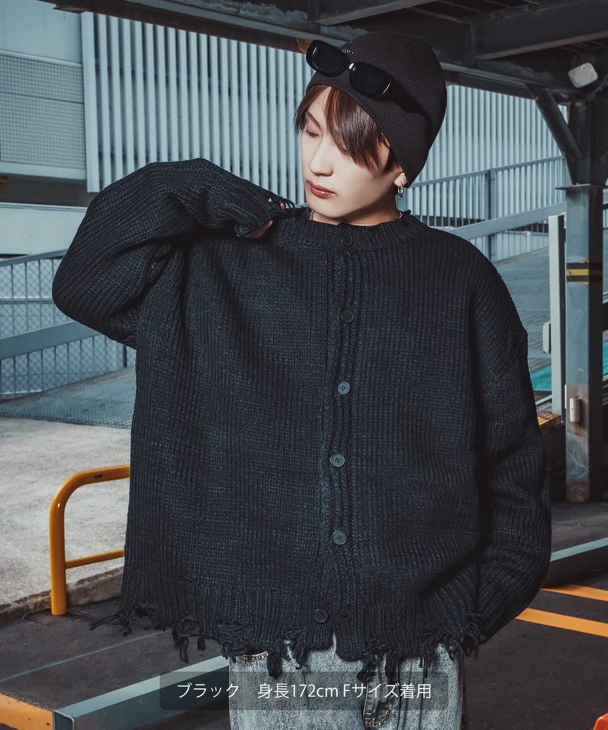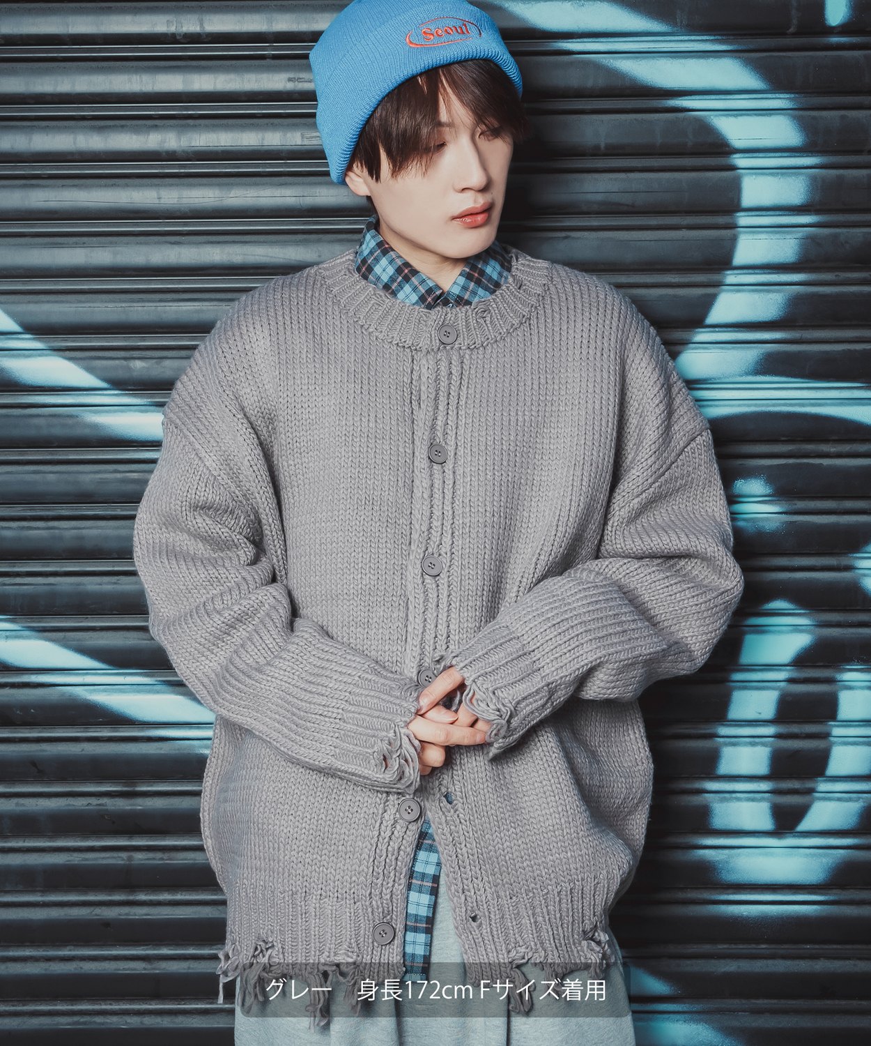 Attention ※ウエストにゴムが入ったパンツのウエスト値は、推奨ウエストのサイズです。伸縮値では御座いませんのでご注意下さい。 ※大量生産による生産過程におきまして、 若干の個体差(1cmから2cm)が生じる場合がございます。 それ以上の差異がある場合は弊社までお問い合わせください。 【サイズの測り方についての詳細はこちら】 ※サイトに掲載されている商品は、モニター環境により実際のものと素材感・色が若干異なって見える場合がございます。 ※加工具合により掲載画像との誤差が見られる場合もございます。 予めご了承くださいますようお願い申し上げます。 image ![]() ![]() ![]() ![]() ![]() ![]() ![]() ![]() ![]() ![]() ![]() ![]() ![]() ![]() ![]() ![]() ![]() ![]() ![]() ![]() 素材・ディテールにこだわったグランジテイストのダメージカーディガン。 ●ざっくりとした太畝の編み地と、袖口・裾に施されたダメージ加工が特徴 ●あえてほつれやフリンジを残したデザインが、退廃的でグランジなムードを演出 ●アクリル100%で、チクチクしにくく肌触りの良い着心地 ●ブラックとグレーのベーシックなカラー展開で、どんなアイテムにも合わせやすいのが魅力 ゆったりとしたオーバーサイズ・ビッグシルエットで、ルーズな今どきスタイルが完成! フロントボタンは同色系で統一し、全体の雰囲気を邪魔しないミニマルなデザインです。 黒を選び、スキニーパンツやブーツと合わせると、よりグランジな雰囲気に。グレーは軽さを出してカジュアルダウンできます。羽織りとしてはもちろん、ボタンを閉めてニットとして着るのもおすすめです。 ほつれとダメージがストリートな雰囲気!退廃的なグランジムードを醸し出すルーズなビッグカーディガン
