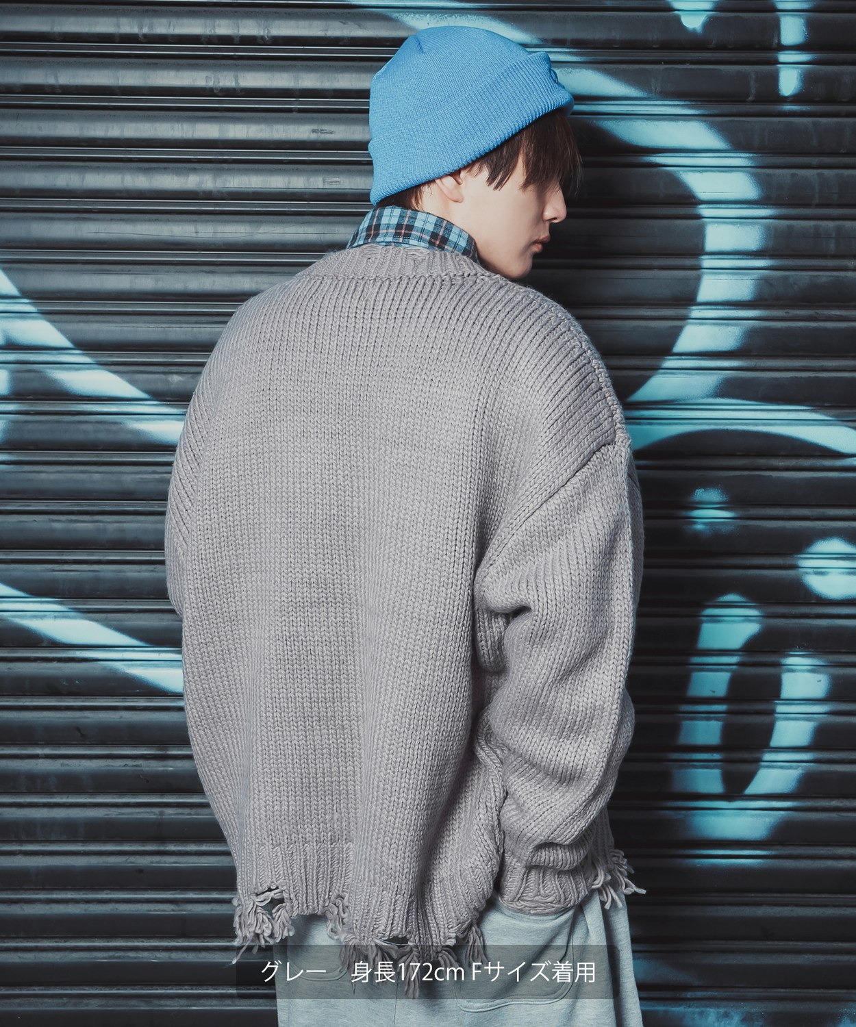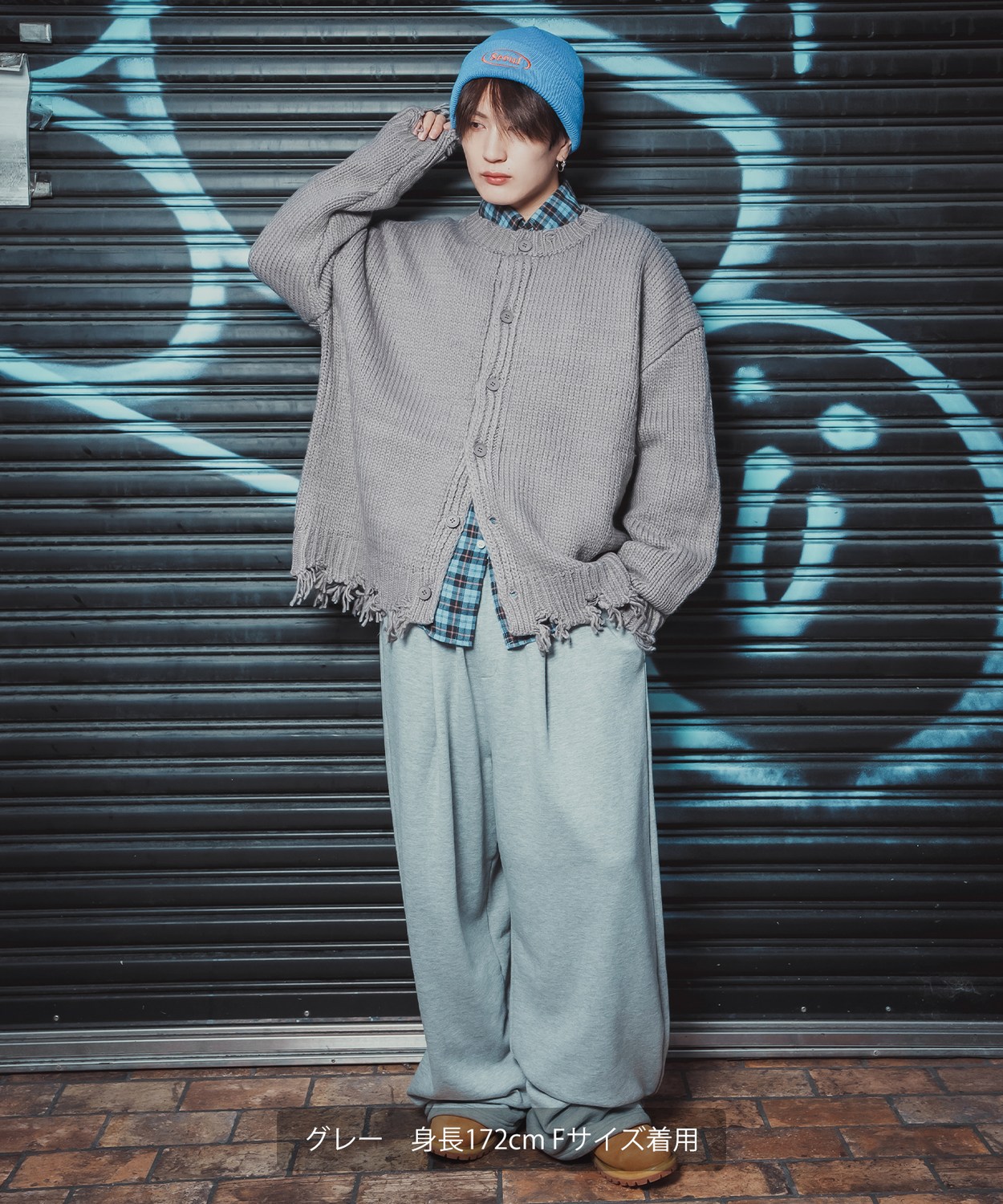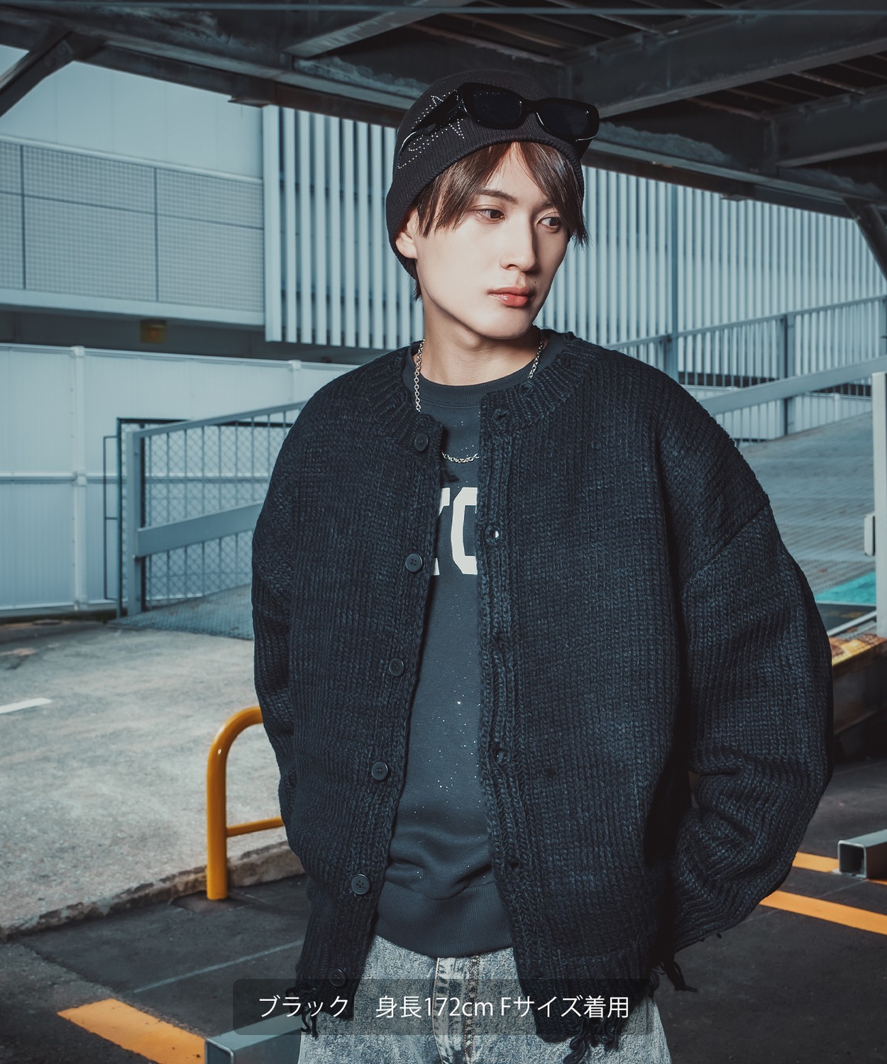 Attention ※ウエストにゴムが入ったパンツのウエスト値は、推奨ウエストのサイズです。伸縮値では御座いませんのでご注意下さい。 ※大量生産による生産過程におきまして、 若干の個体差(1cmから2cm)が生じる場合がございます。 それ以上の差異がある場合は弊社までお問い合わせください。 【サイズの測り方についての詳細はこちら】 ※サイトに掲載されている商品は、モニター環境により実際のものと素材感・色が若干異なって見える場合がございます。 ※加工具合により掲載画像との誤差が見られる場合もございます。 予めご了承くださいますようお願い申し上げます。 image ![]() ![]() ![]() ![]() ![]() ![]() ![]() ![]() ![]() ![]() ![]() ![]() ![]() ![]() ![]() ![]() ![]() ![]() ![]() ![]() 素材・ディテールにこだわったグランジテイストのダメージカーディガン。 ●ざっくりとした太畝の編み地と、袖口・裾に施されたダメージ加工が特徴 ●あえてほつれやフリンジを残したデザインが、退廃的でグランジなムードを演出 ●アクリル100%で、チクチクしにくく肌触りの良い着心地 ●ブラックとグレーのベーシックなカラー展開で、どんなアイテムにも合わせやすいのが魅力 ゆったりとしたオーバーサイズ・ビッグシルエットで、ルーズな今どきスタイルが完成! フロントボタンは同色系で統一し、全体の雰囲気を邪魔しないミニマルなデザインです。 黒を選び、スキニーパンツやブーツと合わせると、よりグランジな雰囲気に。グレーは軽さを出してカジュアルダウンできます。羽織りとしてはもちろん、ボタンを閉めてニットとして着るのもおすすめです。 ほつれとダメージがストリートな雰囲気!退廃的なグランジムードを醸し出すルーズなビッグカーディガン