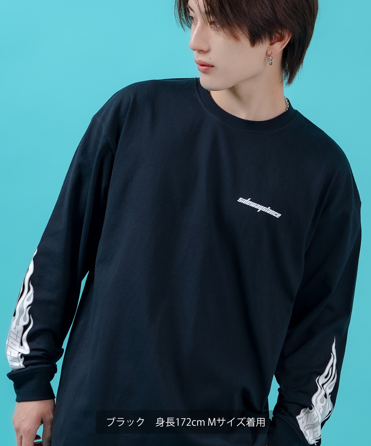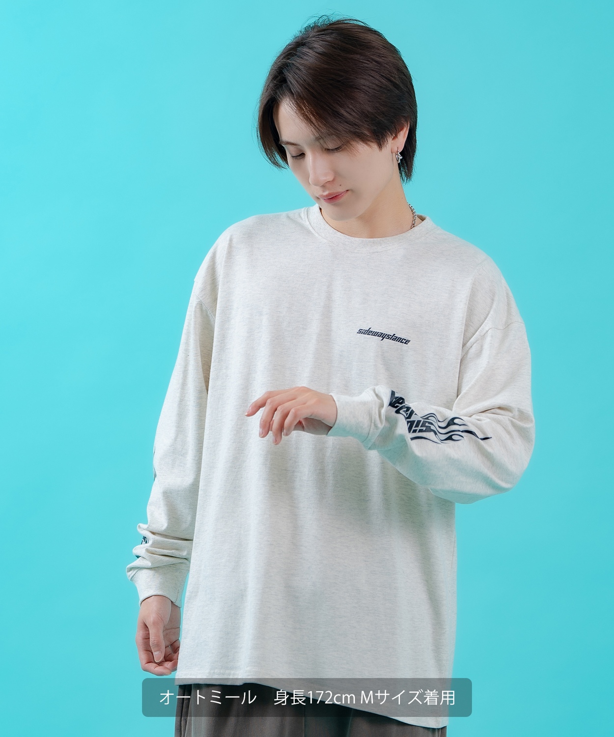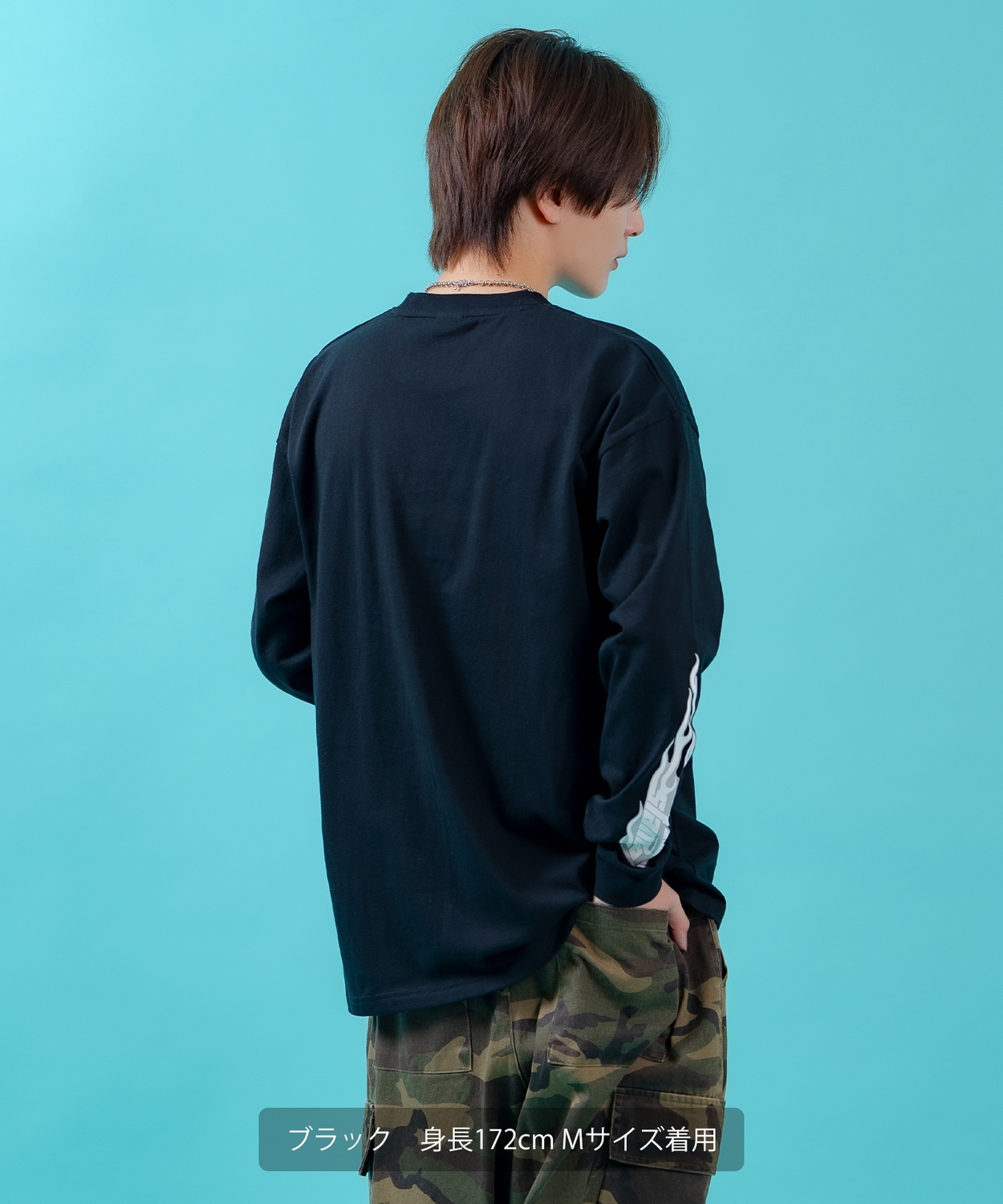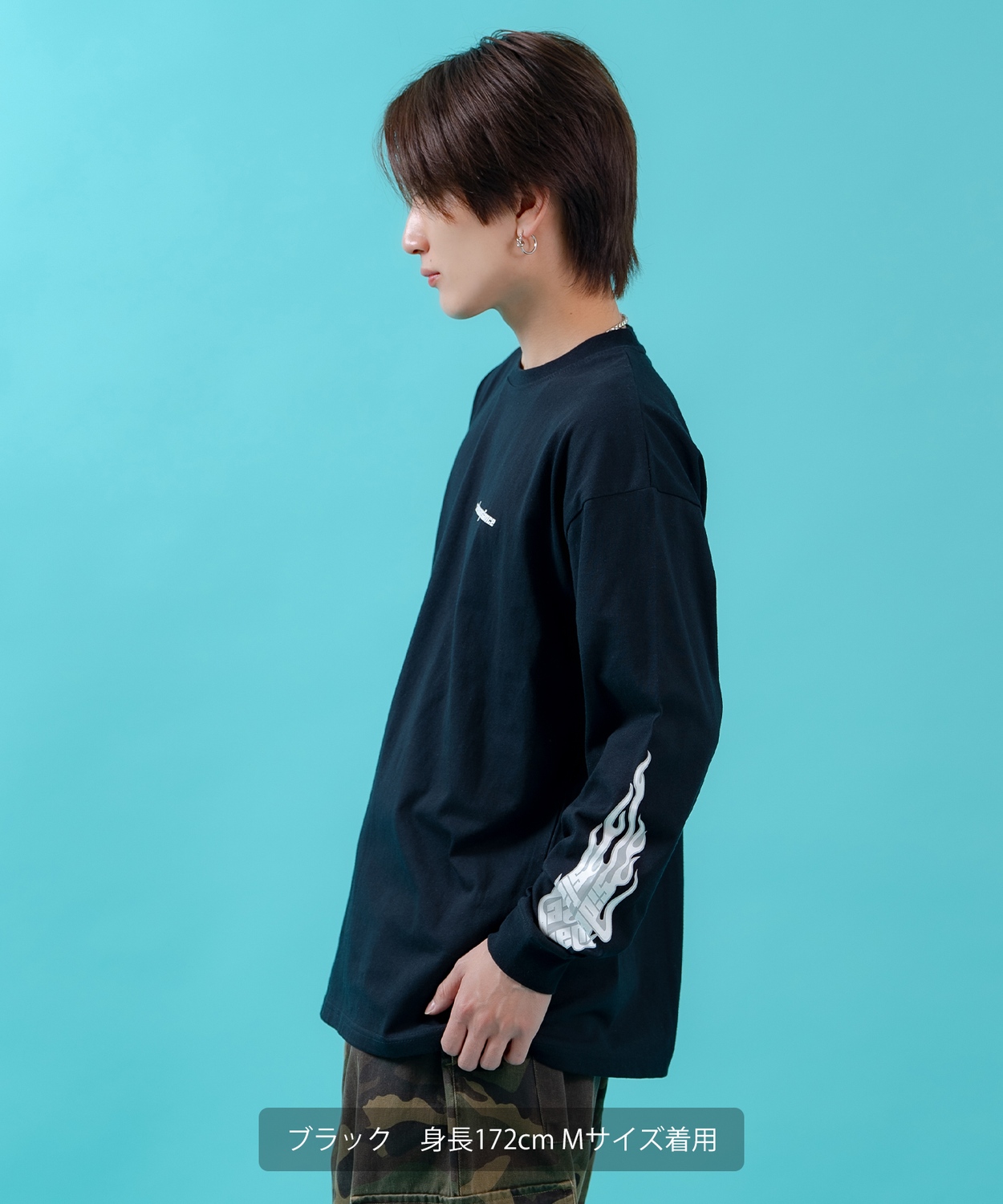 Item Info 両袖のダイナミックなグラフィックが目を引く長袖Tシャツ。 ●エッジの効いたファイヤーパターンのアームプリント ●胸元にはシンプルなブランドロゴを配置 ●首元や袖口はよれにくいリブ仕様 ●タフで肌触りの良いコットン100%の天竺素材 袖を通すだけでストリートシーンに映える、存在感抜群の一着です。 インパクトのあるアームロゴは、ベストを重ねたレイヤードスタイルでもしっかりと個性を主張。 ゆったりとした身幅とドロップショルダーが、リラックス感のある今どきなシルエットを演出します。 ワイドパンツやデニムと合わせた王道のスケータースタイルに最適なアイテムです。 Item Size