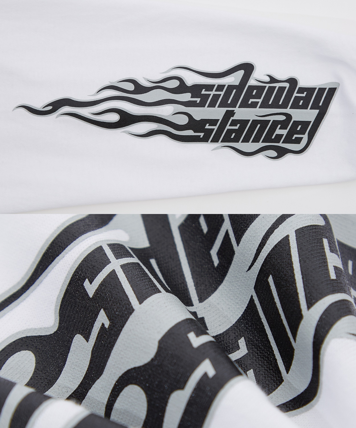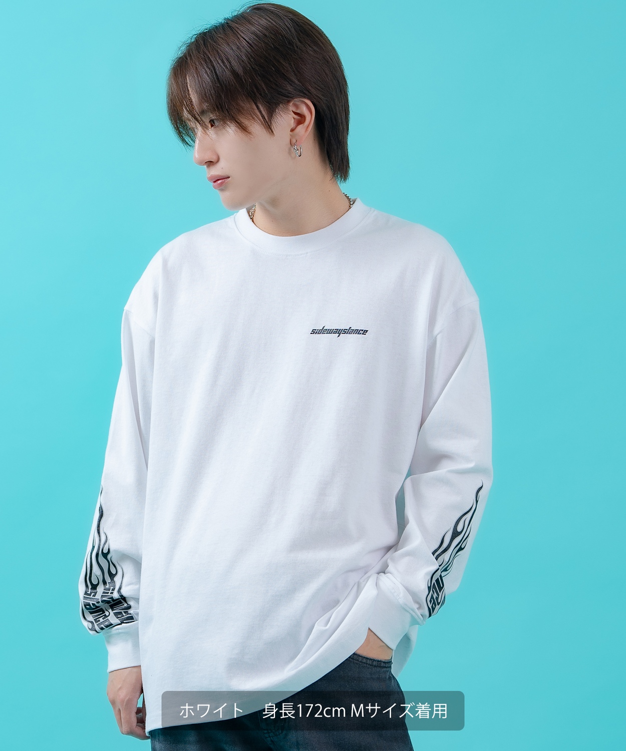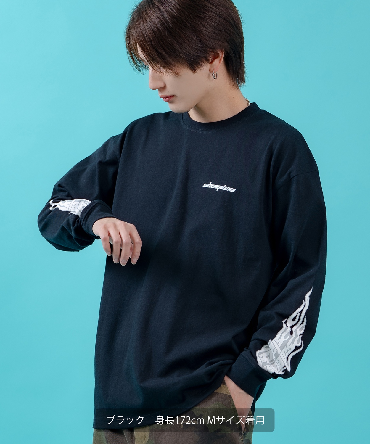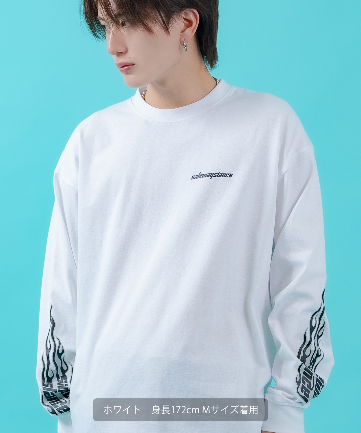 Item Info 両袖のダイナミックなグラフィックが目を引く長袖Tシャツ。 ●エッジの効いたファイヤーパターンのアームプリント ●胸元にはシンプルなブランドロゴを配置 ●首元や袖口はよれにくいリブ仕様 ●タフで肌触りの良いコットン100%の天竺素材 袖を通すだけでストリートシーンに映える、存在感抜群の一着です。 インパクトのあるアームロゴは、ベストを重ねたレイヤードスタイルでもしっかりと個性を主張。 ゆったりとした身幅とドロップショルダーが、リラックス感のある今どきなシルエットを演出します。 ワイドパンツやデニムと合わせた王道のスケータースタイルに最適なアイテムです。 Item Size