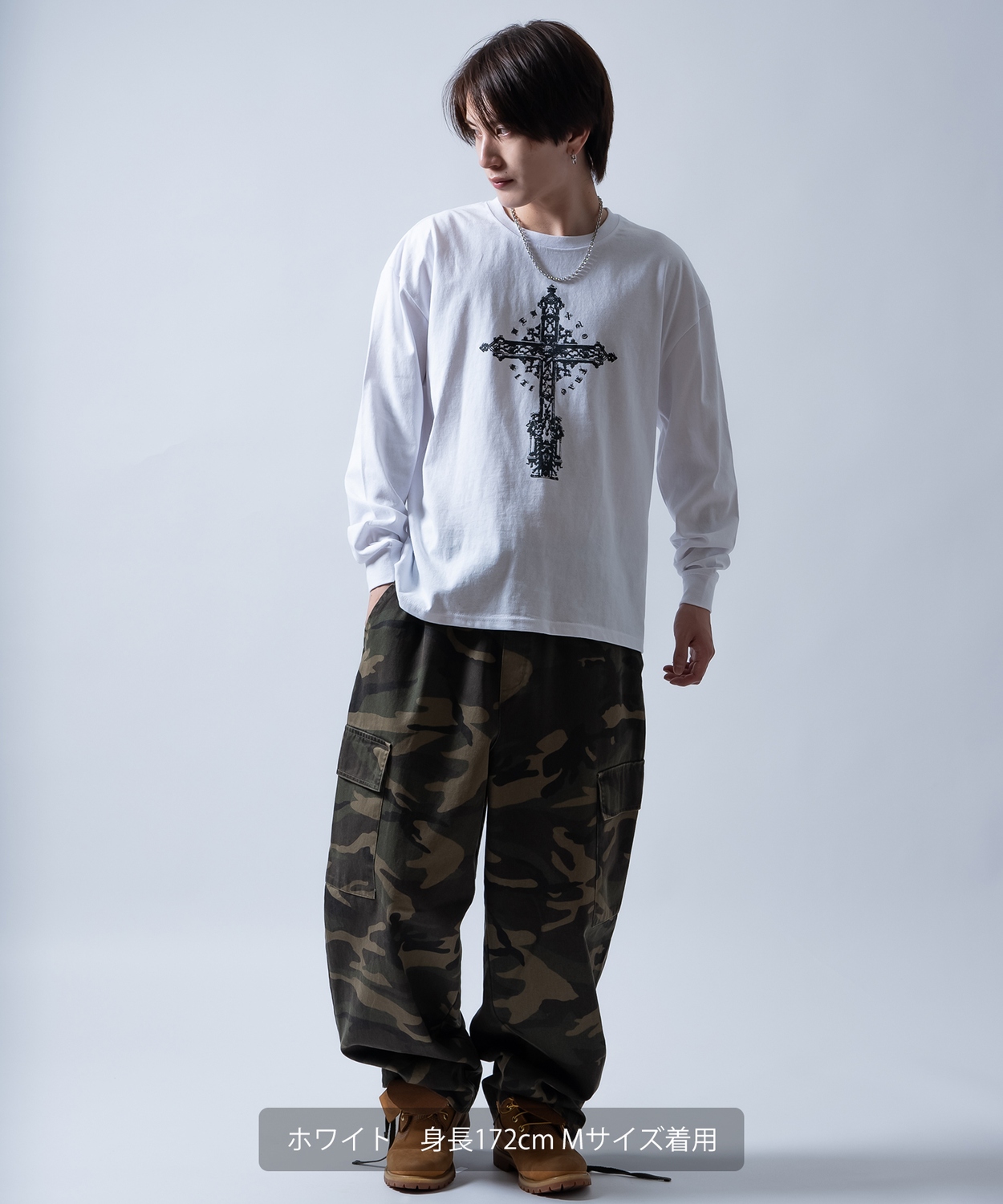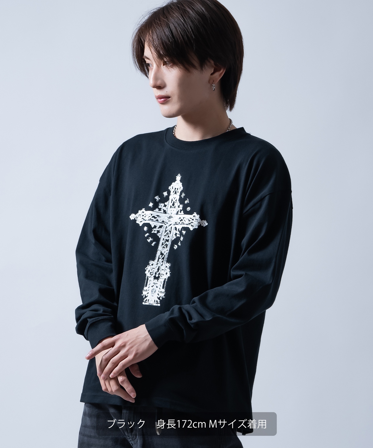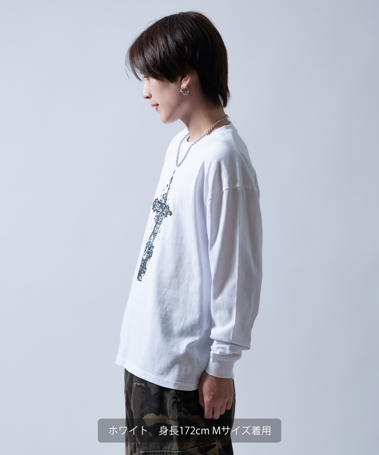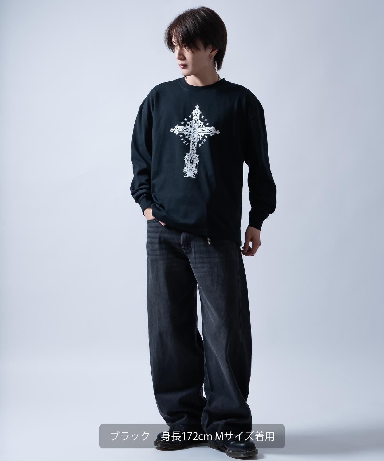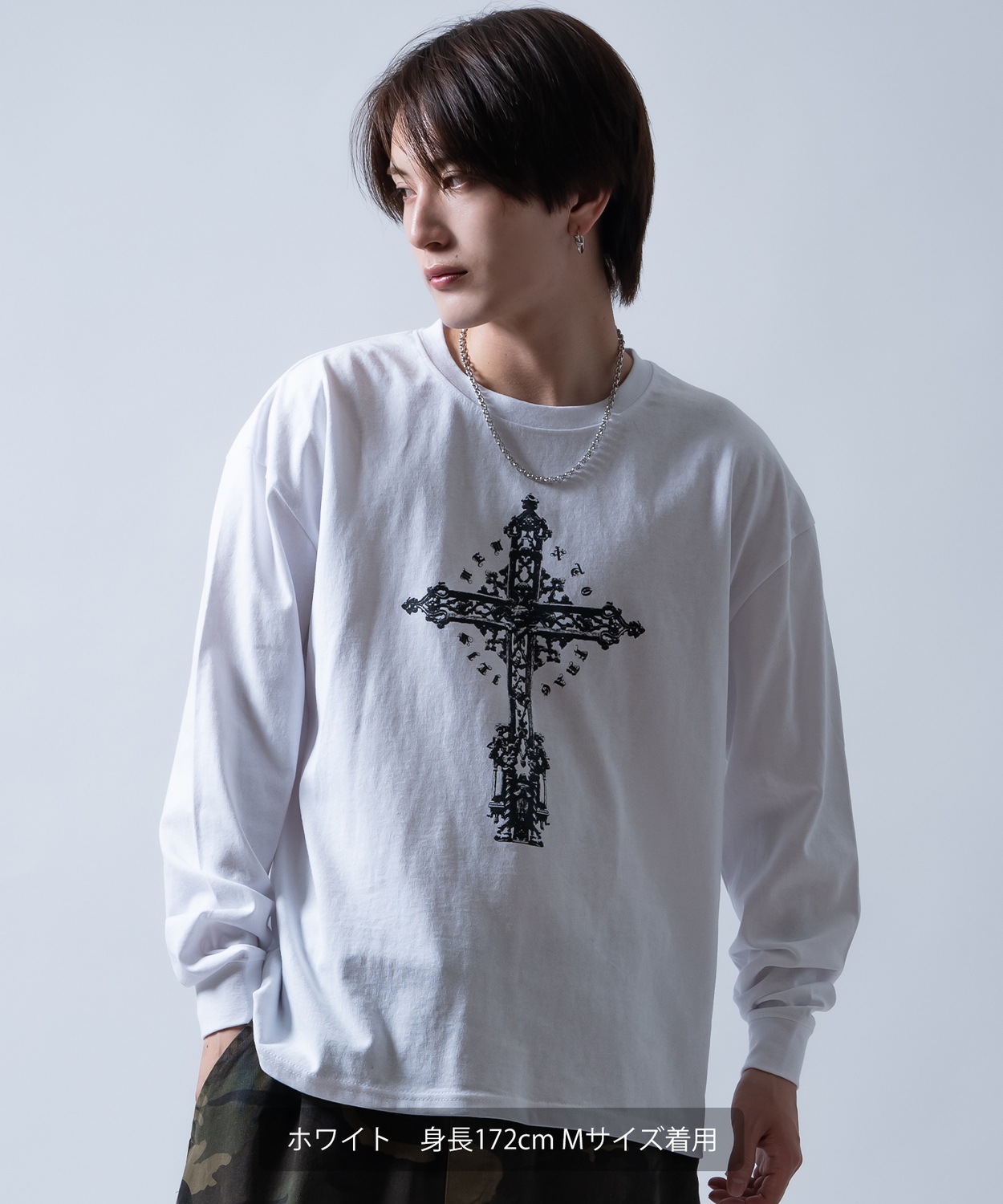 Attention ※ウエストにゴムが入ったパンツのウエスト値は、推奨ウエストのサイズです。伸縮値では御座いませんのでご注意下さい。 ※大量生産による生産過程におきまして、 若干の個体差(1cmから2cm)が生じる場合がございます。 それ以上の差異がある場合は弊社までお問い合わせください。 【サイズの測り方についての詳細はこちら】 ※サイトに掲載されている商品は、モニター環境により実際のものと素材感・色が若干異なって見える場合がございます。 ※加工具合により掲載画像との誤差が見られる場合もございます。 予めご了承くださいますようお願い申し上げます。 image ![]() ![]() ![]() ![]() ![]() ![]() ![]() ![]() ![]() ![]() ![]() ![]() ![]() 繊細なグラフィックが目を引くクロスプリント長袖Tシャツ。 ●重厚感のあるアンティーク調のクロスデザイン ●肌馴染みの良いコットン100%素材を採用 ●首元や袖口はよれにくいリブ仕様 ●ユニセックスで着用可能なジェンダーレスデザイン ヴィンテージライクな十字架のグラフィックが、着こなしにエッジを効かせる1枚です。 モノトーン構成なので、ストリートスタイルはもちろん、地雷系やゴシック、古着MIXなど幅広いテイストにマッチします。 1枚での着用はもちろん、インナーとしてプリントを覗かせるレイヤードスタイルもおすすめです。 存在感あるアンティーク調のクロスプリントが目を引く!タフな生地感とルーズなシルエットでストリートや地雷系スタイルを格上げする主役級ロンT!