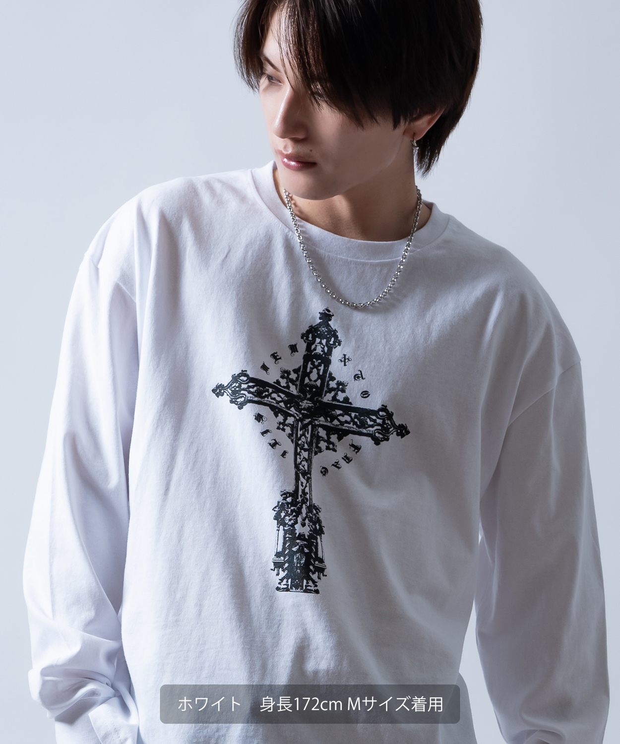 Item Info 繊細なグラフィックが目を引くクロスプリント長袖Tシャツ。 ●重厚感のあるアンティーク調のクロスデザイン ●肌馴染みの良いコットン100%素材を採用 ●首元や袖口はよれにくいリブ仕様 ●ユニセックスで着用可能なジェンダーレスデザイン ヴィンテージライクな十字架のグラフィックが、着こなしにエッジを効かせる1枚です。 モノトーン構成なので、ストリートスタイルはもちろん、地雷系やゴシック、古着MIXなど幅広いテイストにマッチします。 1枚での着用はもちろん、インナーとしてプリントを覗かせるレイヤードスタイルもおすすめです。 Item Size