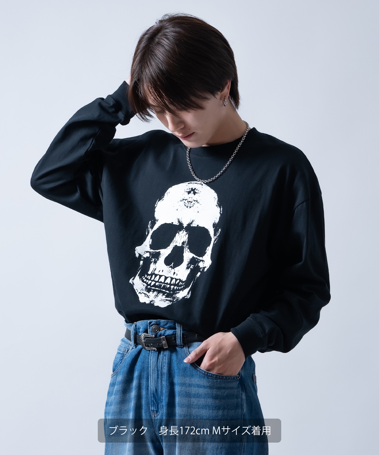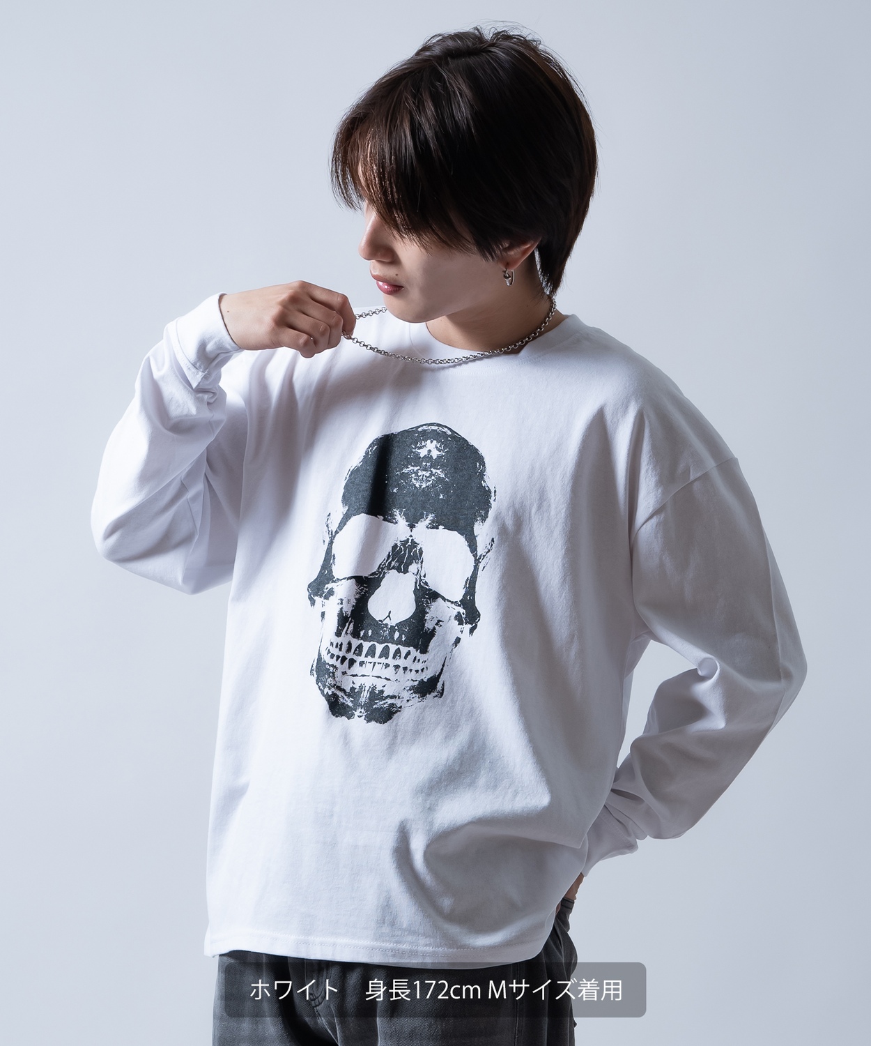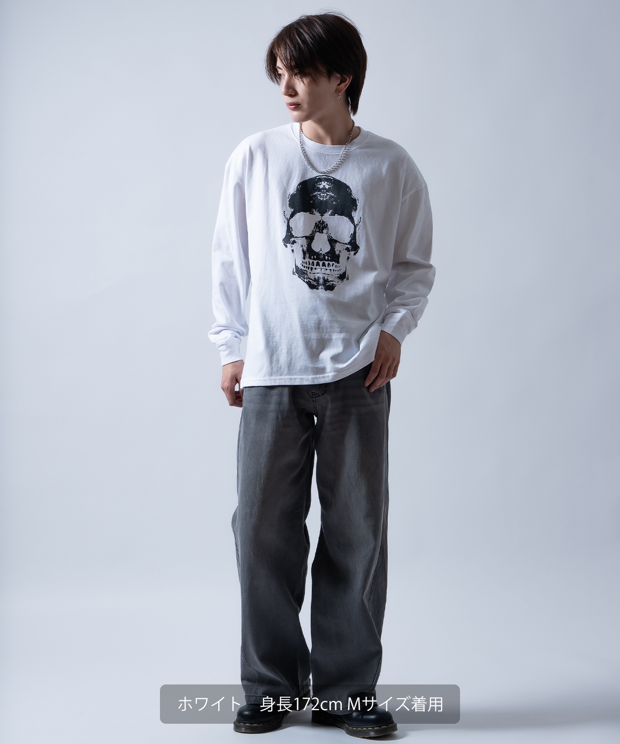 Item Info インパクト抜群のビッグスカルプリントが目を引く長袖Tシャツ。 ●存在感のあるフロントのスカルグラフィック ●こなれ感を演出する絶妙なかすれプリント ●肌なじみが良く、ロングシーズン着回せる綿100%素材 ●ゆったりとした旬のビッグシルエット フロントに大胆に施されたスカルプリントが、ロックやパンクなエッセンスを醸し出す一着です。 ヴィンテージの古着のような質感を表現したかすれプリントが、ストリートスタイルに深みを与えます。 身幅をたっぷりと取ったオーバーサイズ設計なので、一枚で着てもサマになり、レイヤードのインナーとしても重宝します。 デニムやワイドパンツと合わせて、エッジの効いたスタイリングを楽しむのがおすすめです。 Item Size