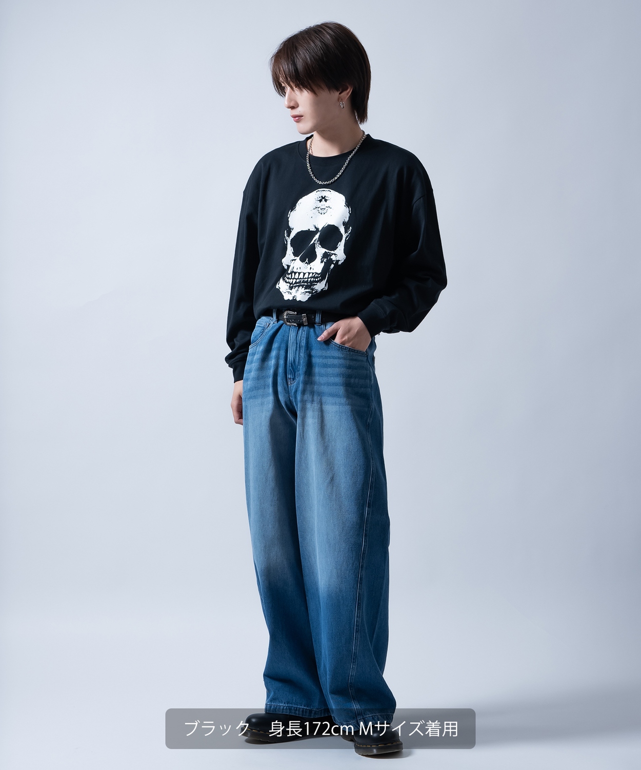 Attention ※ウエストにゴムが入ったパンツのウエスト値は、推奨ウエストのサイズです。伸縮値では御座いませんのでご注意下さい。 ※大量生産による生産過程におきまして、 若干の個体差(1cmから2cm)が生じる場合がございます。 それ以上の差異がある場合は弊社までお問い合わせください。 【サイズの測り方についての詳細はこちら】 ※サイトに掲載されている商品は、モニター環境により実際のものと素材感・色が若干異なって見える場合がございます。 ※加工具合により掲載画像との誤差が見られる場合もございます。 予めご了承くださいますようお願い申し上げます。 image ![]() ![]() ![]() ![]() ![]() ![]() ![]() ![]() ![]() ![]() ![]() ![]() ![]() ![]() ![]() インパクト抜群のビッグスカルプリントが目を引く長袖Tシャツ。 ●存在感のあるフロントのスカルグラフィック ●こなれ感を演出する絶妙なかすれプリント ●肌なじみが良く、ロングシーズン着回せる綿100%素材 ●ゆったりとした旬のビッグシルエット フロントに大胆に施されたスカルプリントが、ロックやパンクなエッセンスを醸し出す一着です。 ヴィンテージの古着のような質感を表現したかすれプリントが、ストリートスタイルに深みを与えます。 身幅をたっぷりと取ったオーバーサイズ設計なので、一枚で着てもサマになり、レイヤードのインナーとしても重宝します。 デニムやワイドパンツと合わせて、エッジの効いたスタイリングを楽しむのがおすすめです。 退廃的なスカルプリントが放つ圧倒的な存在感!ストリートに映えるルーズなシルエットで今どきのロック感を