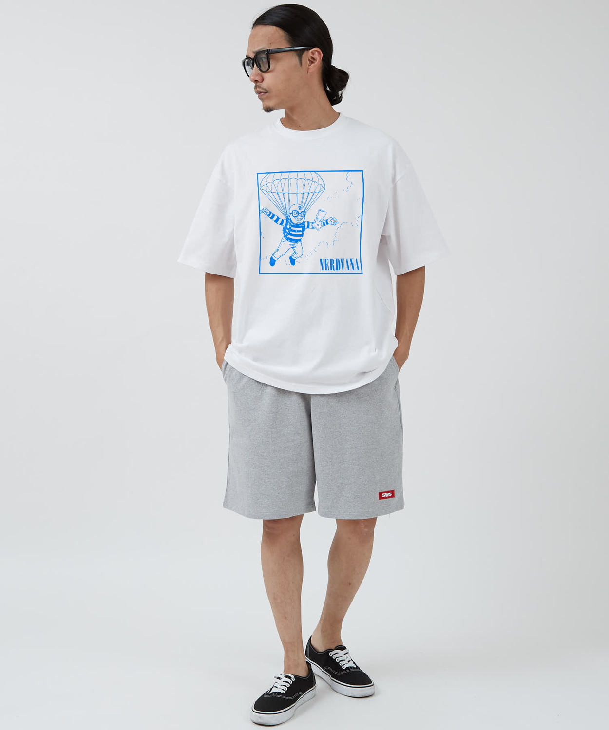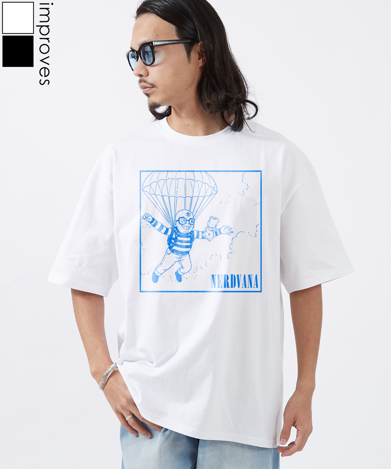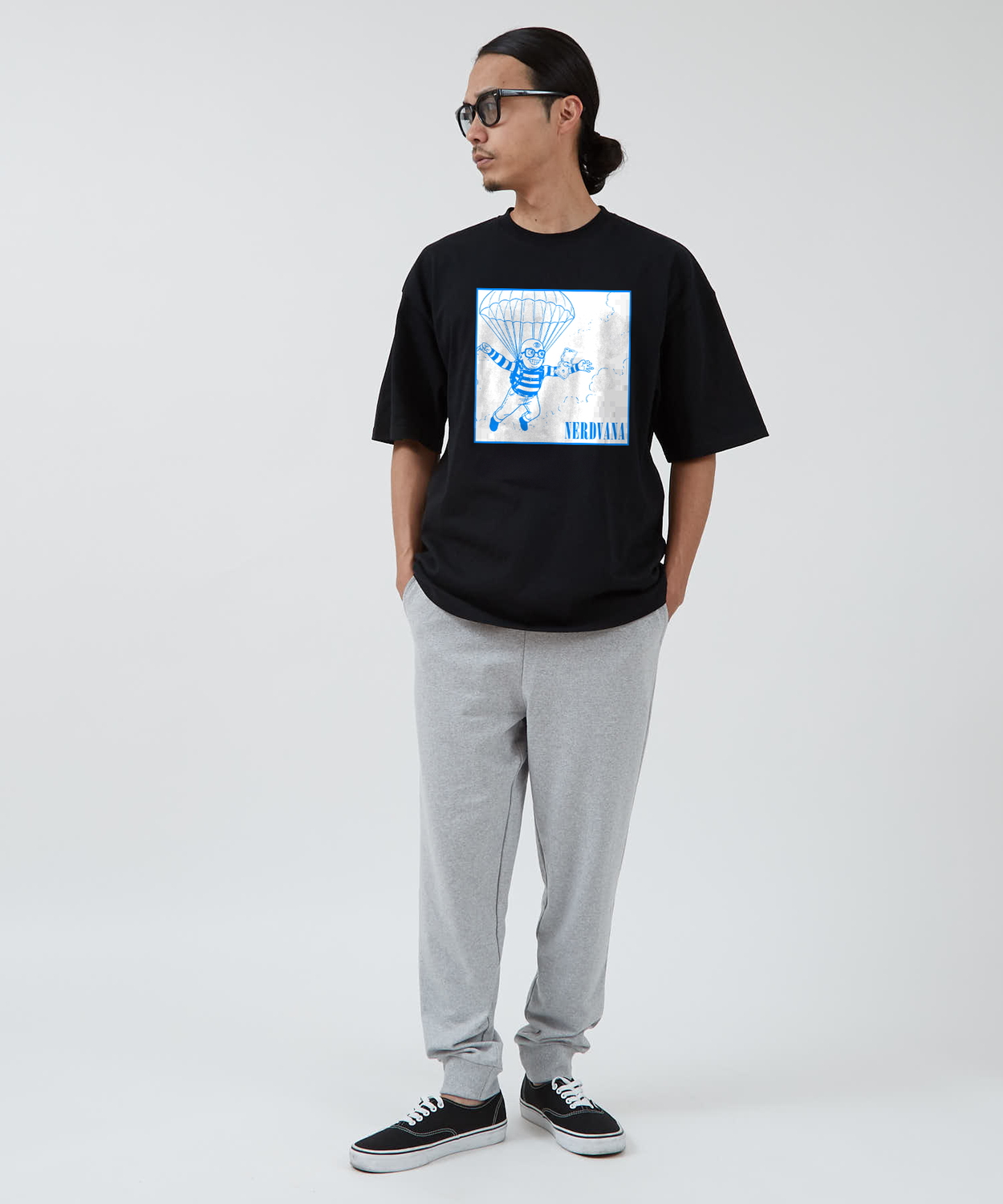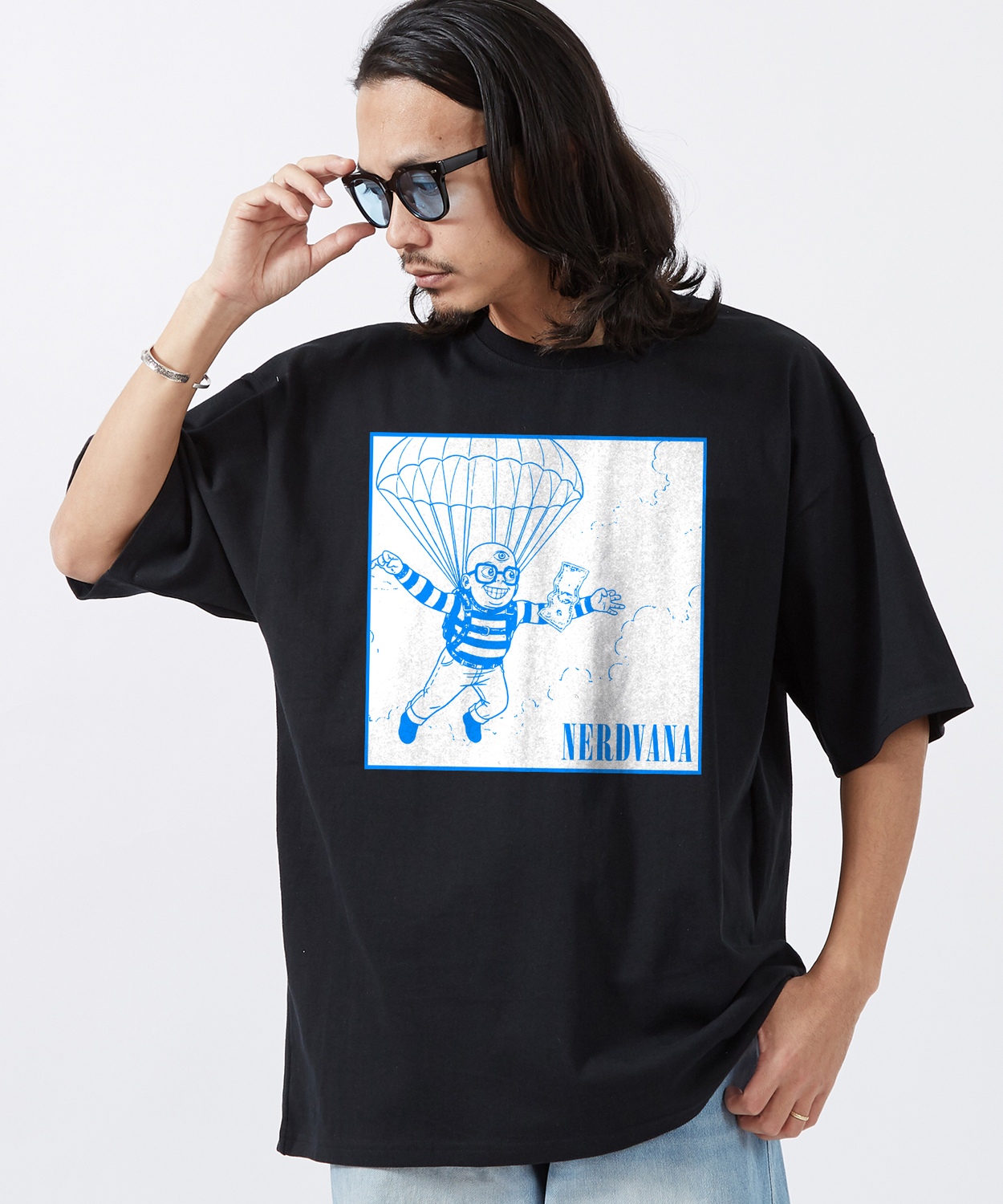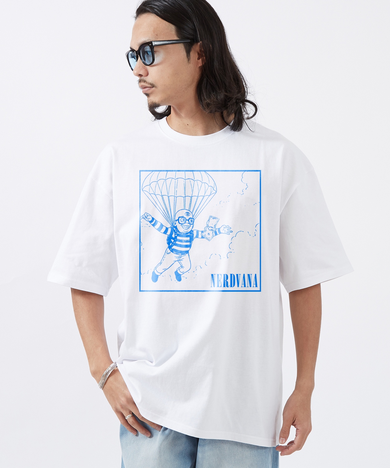 Item Info 「NERDVANA」が贈る、もう一つのNevermind。 NERDVANA イラストト 半袖Tシャツをご紹介。 ●コットン100%の手持ち感のしっかりとしたオリジナルボディを使用 ●ストリートシーンを反映した、ゆったりとしたトレンドのサイズ感 ●象徴的なアートワークをキャラクターアレンジしたグラフィックプリント ●定番のブラック、ホワイトのカラー展開 「NERDVANA」。それは、ナードたちの楽園。 90年代を代表するロックバンドのグラフィックを、コミカルで"ナード"な雰囲気にオマージュしたフォトTシャツが登場。 ブルー1色で描かれたそのグラフィックは、パロディでありながら、ポップアートのような洗練された印象を与えます。 ワイドパンツやデニムと合わせたルーズなストリートスタイルや、 スラックスと合わせてきれいめのハズしとしてもおすすめです。 男女問わず着ていただける、ジェンダーレスなアイテムです。 Item Size