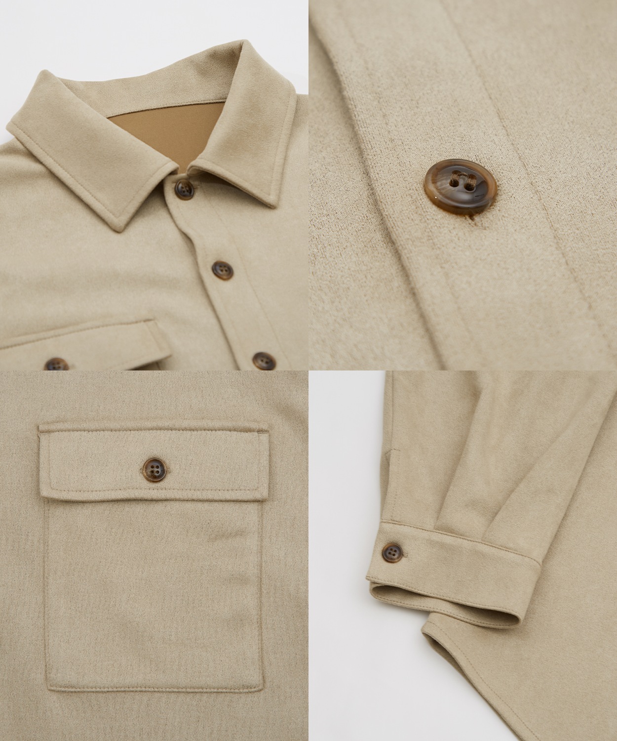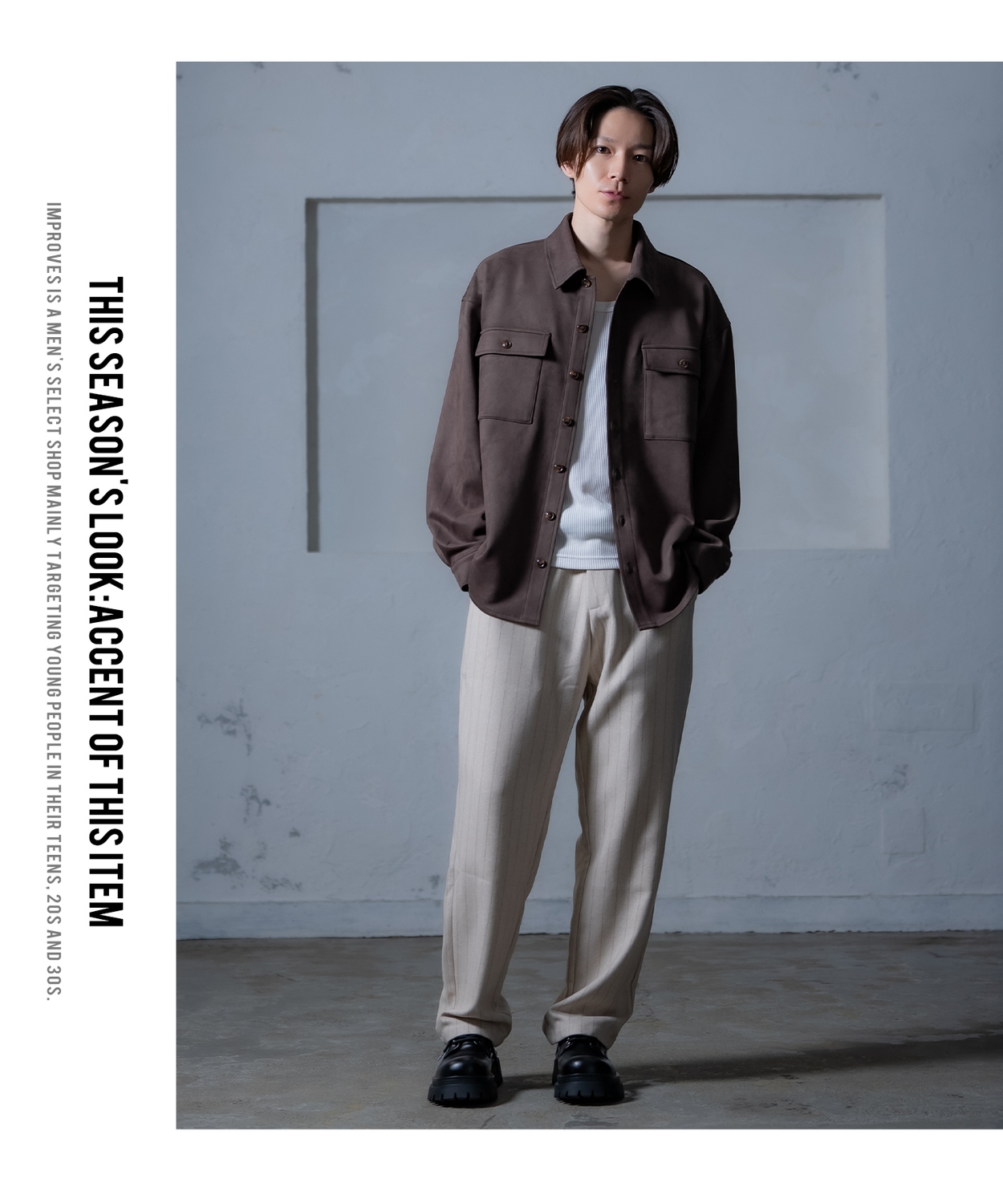 Attention ※ウエストにゴムが入ったパンツのウエスト値は、推奨ウエストのサイズです。伸縮値では御座いませんのでご注意下さい。 ※大量生産による生産過程におきまして、 若干の個体差(1cmから2cm)が生じる場合がございます。 それ以上の差異がある場合は弊社までお問い合わせください。 【サイズの測り方についての詳細はこちら】 ※サイトに掲載されている商品は、モニター環境により実際のものと素材感・色が若干異なって見える場合がございます。 ※加工具合により掲載画像との誤差が見られる場合もございます。 予めご了承くださいますようお願い申し上げます。 image ![]() ![]() ![]() ![]() ![]() ![]() ![]() ![]() ![]() ![]() ![]() ![]() ![]() ![]() ![]() ![]() ![]() ![]() ![]() ![]() 「スエードの上品さとポンチ素材の着心地を両立した。」 万能カジュアルシャツが登場。 ●柔らかく上品なスエード風ポンチ素材 ●フロントにダブルフラップポケットを配置 ●1枚でも、インナーにも合わせやすく、秋冬のコーデに最適 ●主役のブラウンに加え、キャメル、ベージュをセレクト (point) ◆今っぽいスウェードシャツ 2025年の秋冬は、スウェードジャケットが再びトレンドの中心に返り咲いています。 レトロで上品、そして程よい抜け感が大人のカジュアルスタイルにハマる… 程よいゆとりでルーズすぎず、ジャケット感覚でも着用可能な万能シャツ。 デニムやチノパンと合わせてカジュアルから スラックス、ベルト、Tシャツと合わせて大人カジュアルにも最適。 スエードの上品さとポンチ素材の着心地を両立した、万能カジュアルシャツ。