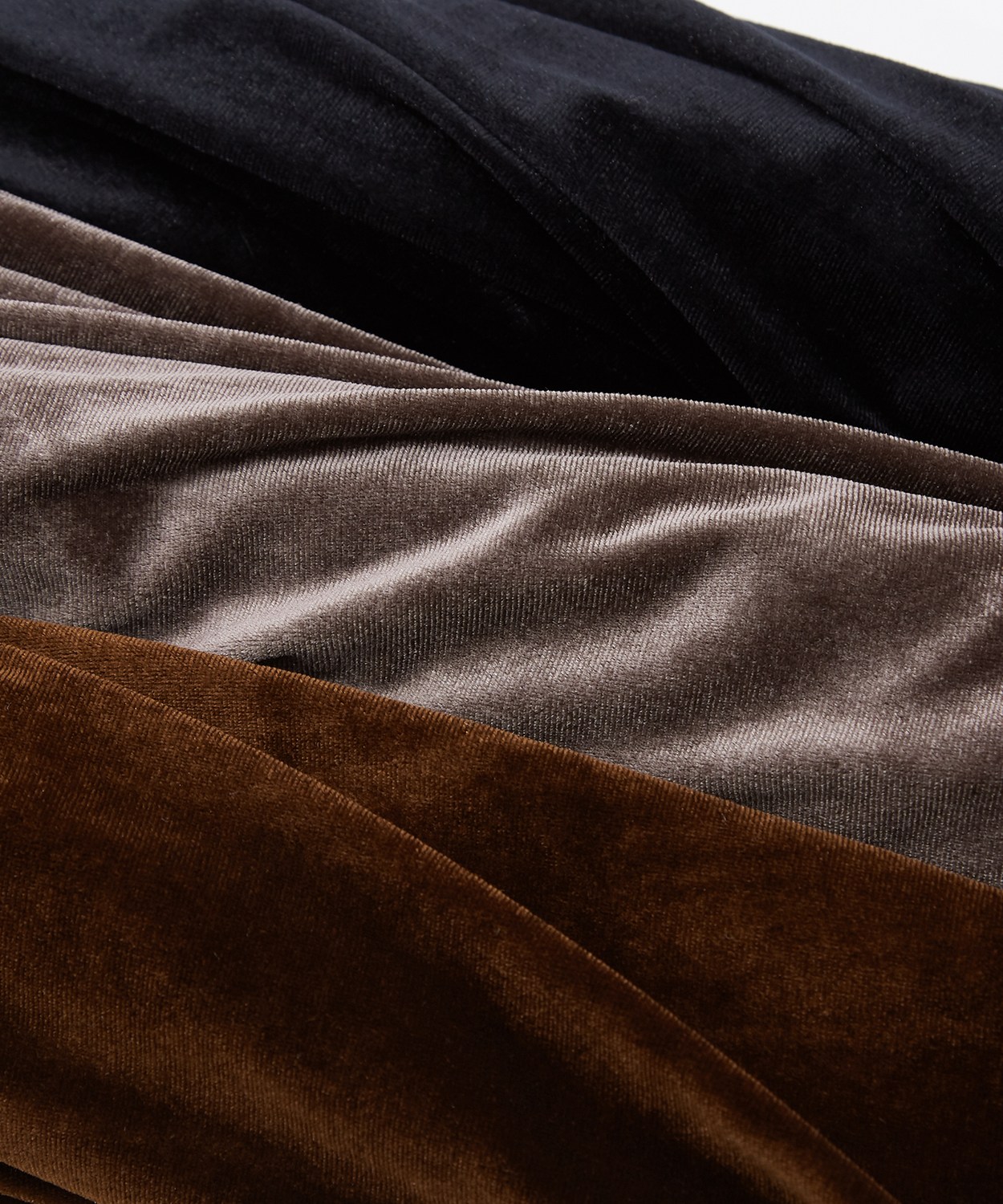 カジュアルなTシャツやスウェットと合わせてもベロアの艶感が大人っぽさを演出し、ブラウスやジャケットと合わせればきれいめなスタイリングにも対応します。