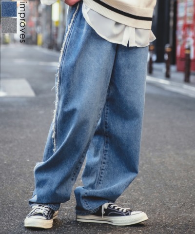 サイドフリンジデザイン ワイドデニムパンツ