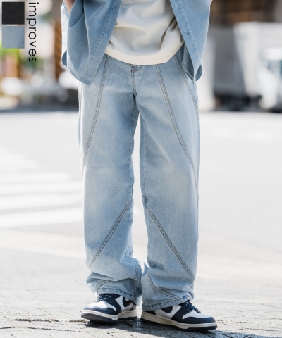 ステッチデザイン ワイドデニムパンツ