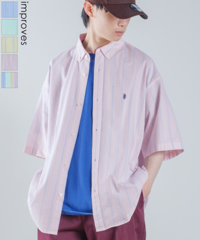 ワンポイント刺しゅう ボタンダウン ストライプ 半袖シャツ
