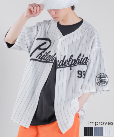 スタジアムロゴ ストライプ 刺しゅう 半袖 ベースボールシャツ
