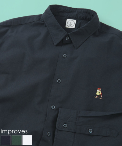 クマ マスコット ワンポイント 刺しゅう 長袖 オックスフォードシャツ