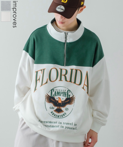プリント 切替デザイン 裏毛スウェット ハーフジップトレーナー