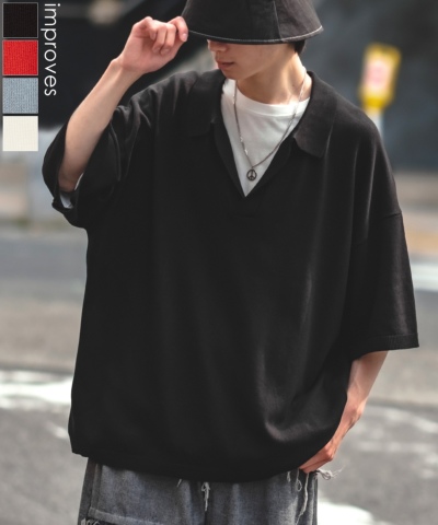 NULL ヌル ニット素材 半袖 スキッパーポロシャツ