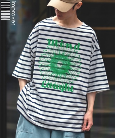 UAU ワオ ボートネック Mind Laught フラワー ロゴ プリント ボーダー 五分袖Tシャツ