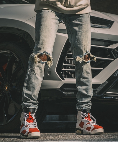 スキニーフィット ダメージ&クラッシュ ブルーデニムパンツ メンズ