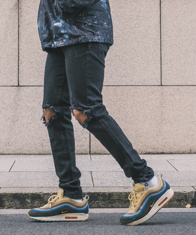 スキニーフィット ダメージ&クラッシュ ブラックデニムパンツ メンズ