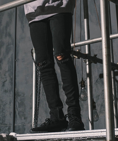 スキニーフィット ダメージ&クラッシュ カットオフ ブラックデニムパンツ メンズ