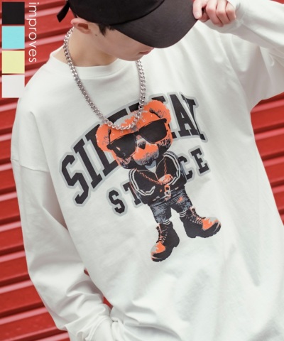 SIDEWAY STANCE サイドウェイスタンス カレッジロゴ&クマ プリント 長袖Tシャツ
