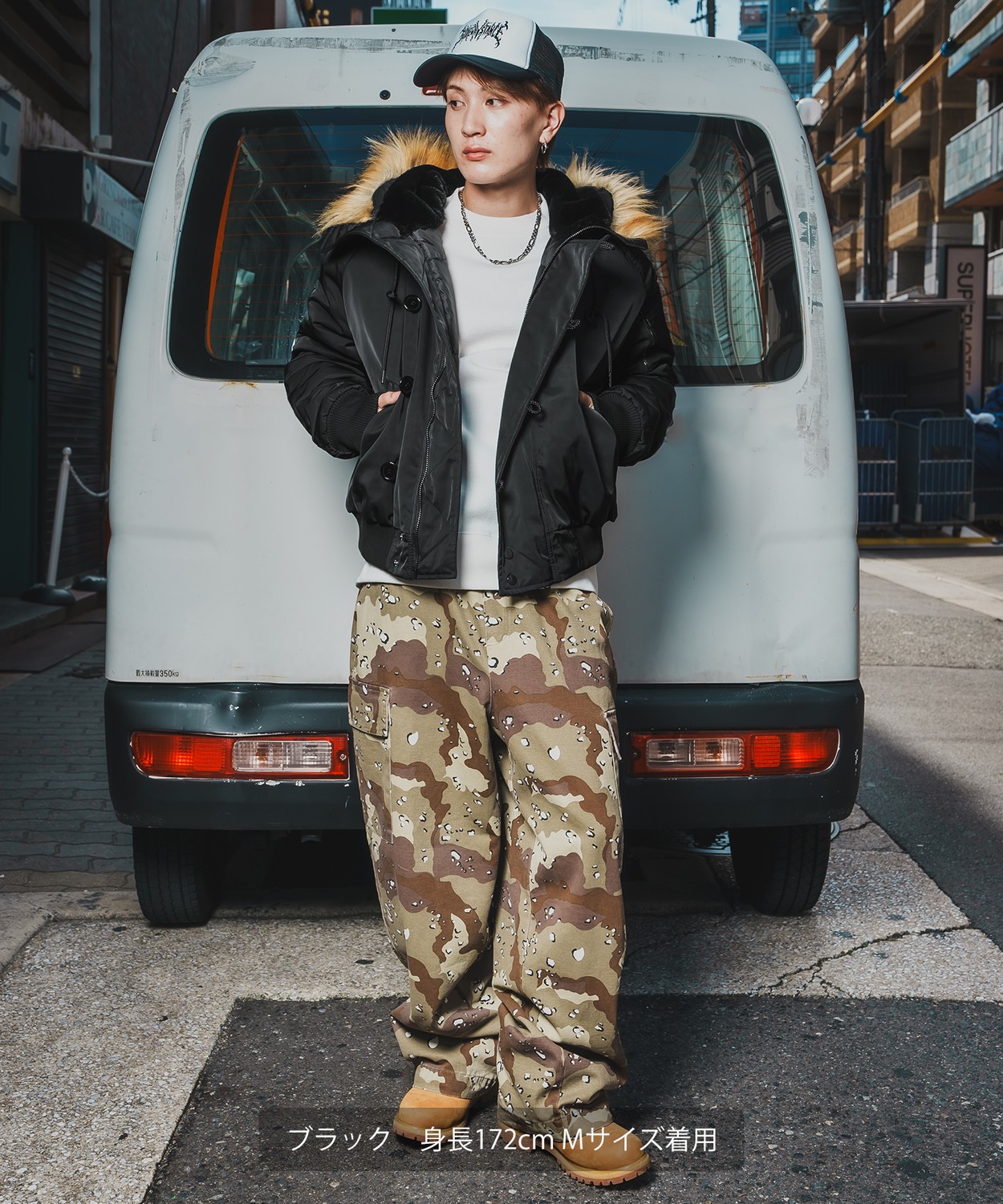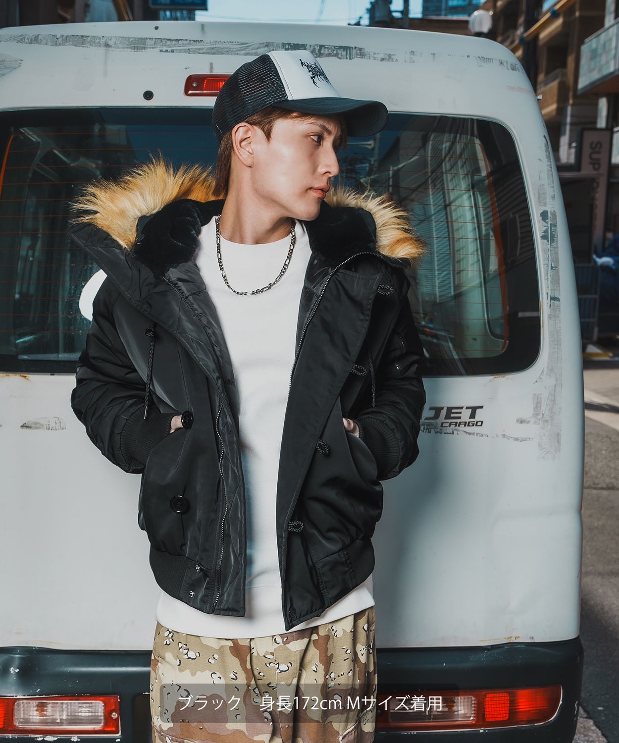 Attention ※ウエストにゴムが入ったパンツのウエスト値は、推奨ウエストのサイズです。伸縮値では御座いませんのでご注意下さい。 ※大量生産による生産過程におきまして、 若干の個体差(1cmから2cm)が生じる場合がございます。 それ以上の差異がある場合は弊社までお問い合わせください。 【サイズの測り方についての詳細はこちら】 ※サイトに掲載されている商品は、モニター環境により実際のものと素材感・色が若干異なって見える場合がございます。 ※加工具合により掲載画像との誤差が見られる場合もございます。 予めご了承くださいますようお願い申し上げます。 image ![]() ![]() ![]() ![]() ![]() ![]() ![]() ![]() ![]() ![]() ![]() ![]() ![]() ![]() ![]() ![]() ![]() ![]() ![]() ![]() ミリタリーテイストの定番アウターに、トレンド感のあるディテールと防寒性をプラスした、秋冬シーズンに大活躍する一着。 ●程よく光沢があり、スレに強い生地を採用 ●取り外し可能なフェイクファー付きのフード、シガレットポケットを装着 ●しっかりと中綿が入っており高い保温性を発揮 ●ゆったりとした身幅とボリューム感のあるシルエットで、旬のストリートスタイル ●ミリタリーの定番のカーキ、使いやすいブラックの2色展開 ディティールやシルエット、素材にこだわったオリジナルフライトジャケット。 Tシャツやパーカーに重ねて、ワイドパンツやカーゴパンツと合わせることで、旬のストリートスタイルが完成します。 ストリート、アメカジ、ワーク、韓国系ファッションと幅広いスタイルに合わせられ メンズライクなレディースにもおすすめしたい本命アウターとなりました。 ミリタリーテイストの定番アウターが新登場