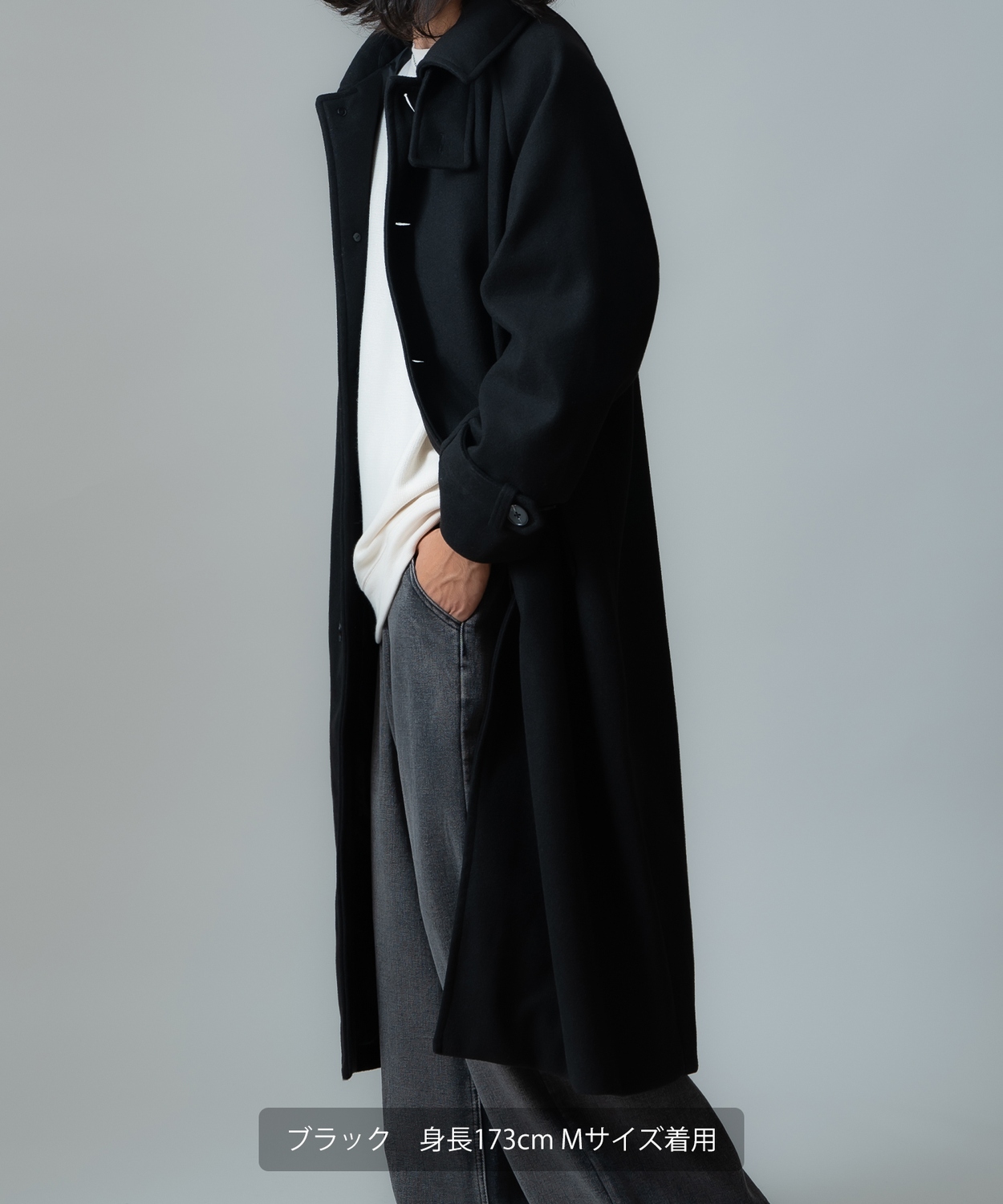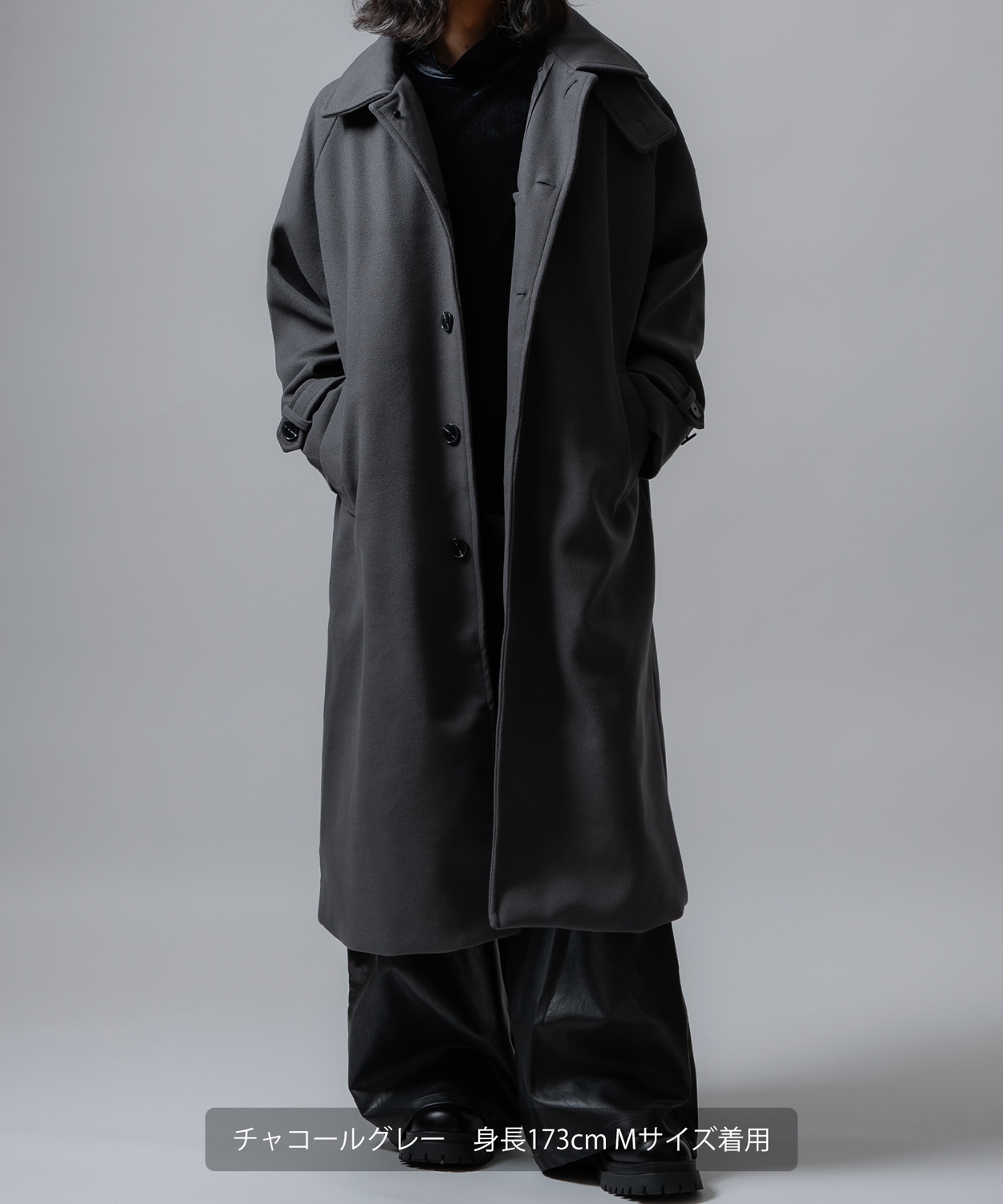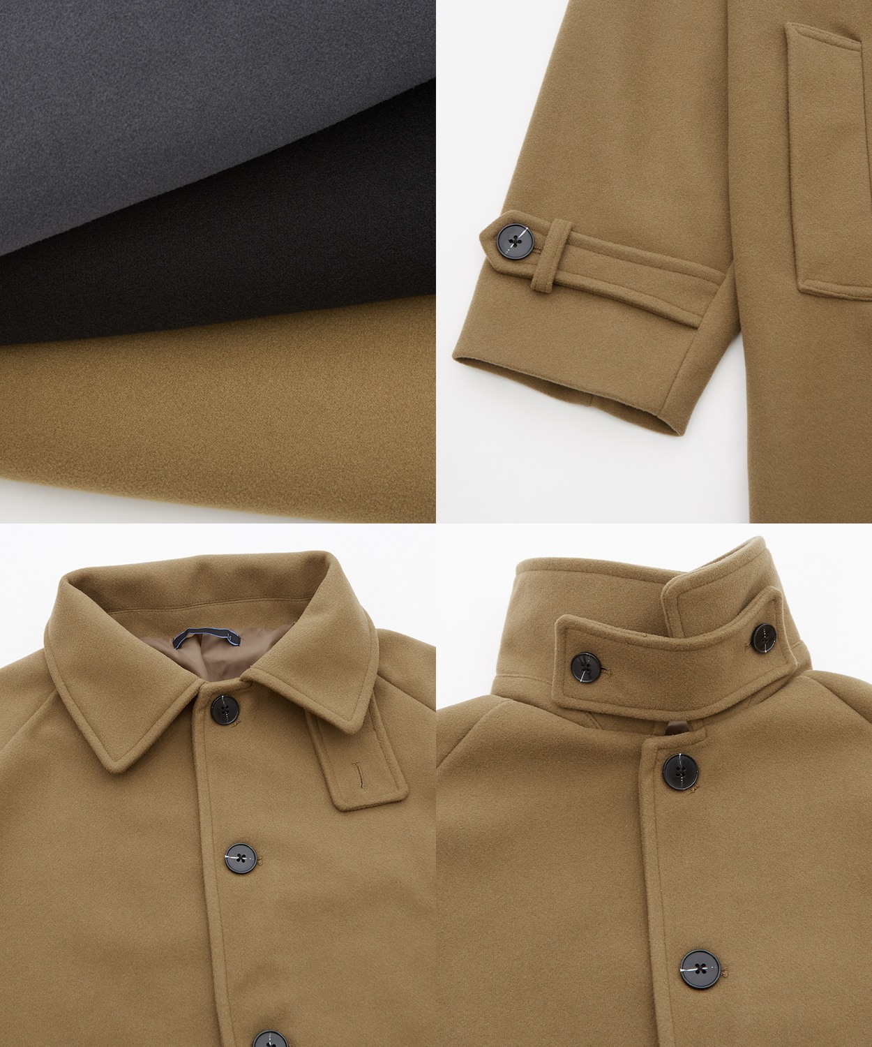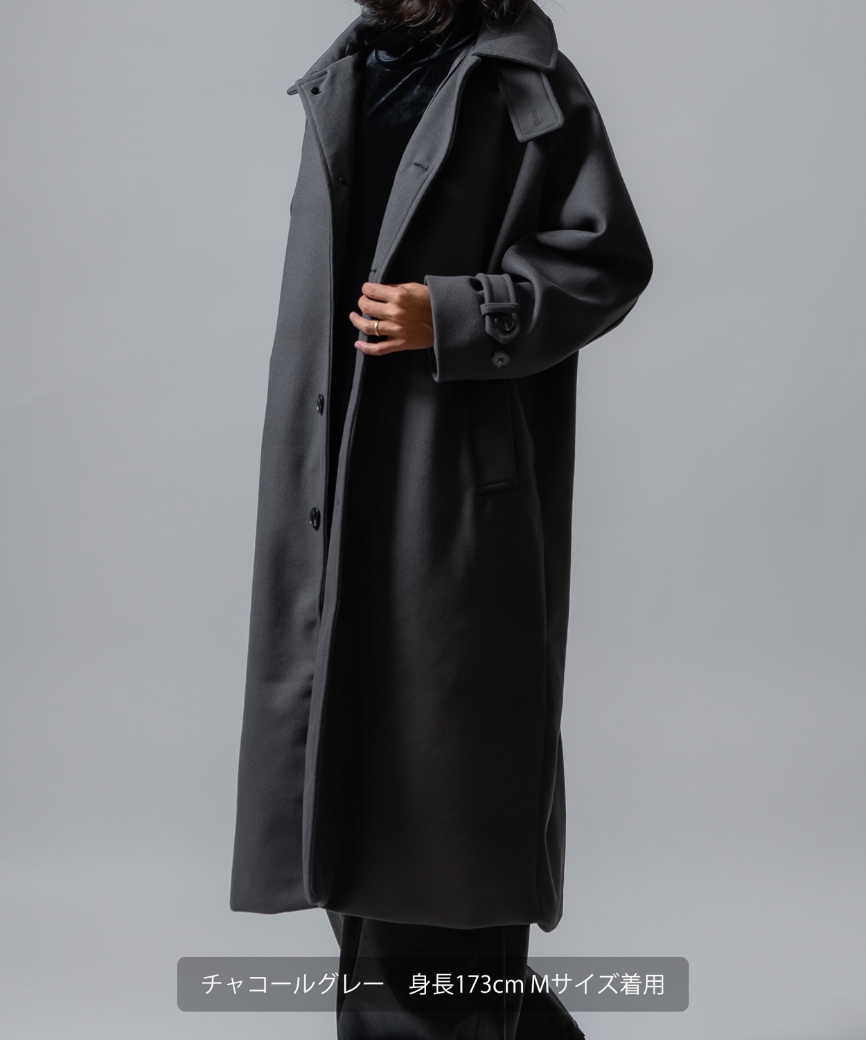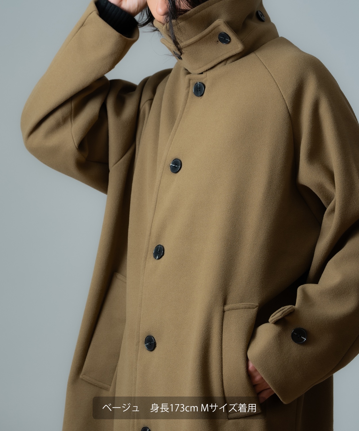 襟を立てたスタンドカラーはモードで都会的な防寒スタイルに。