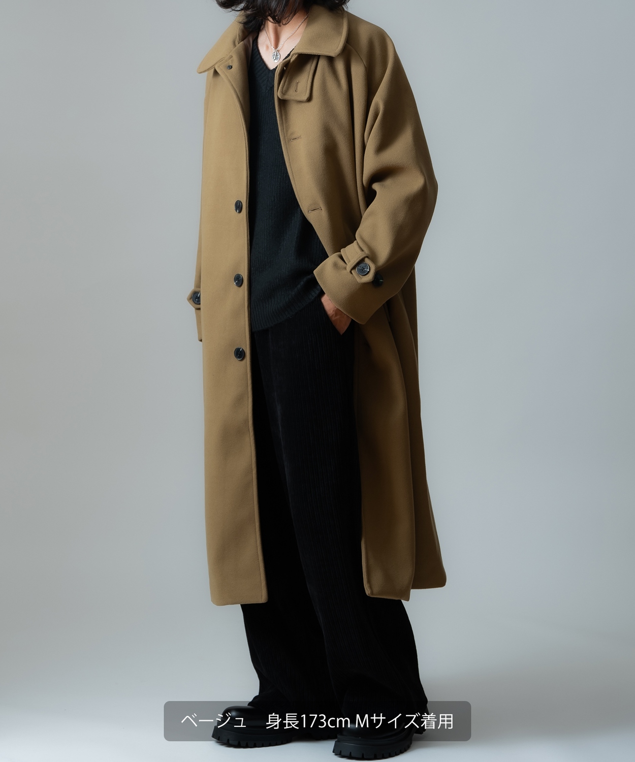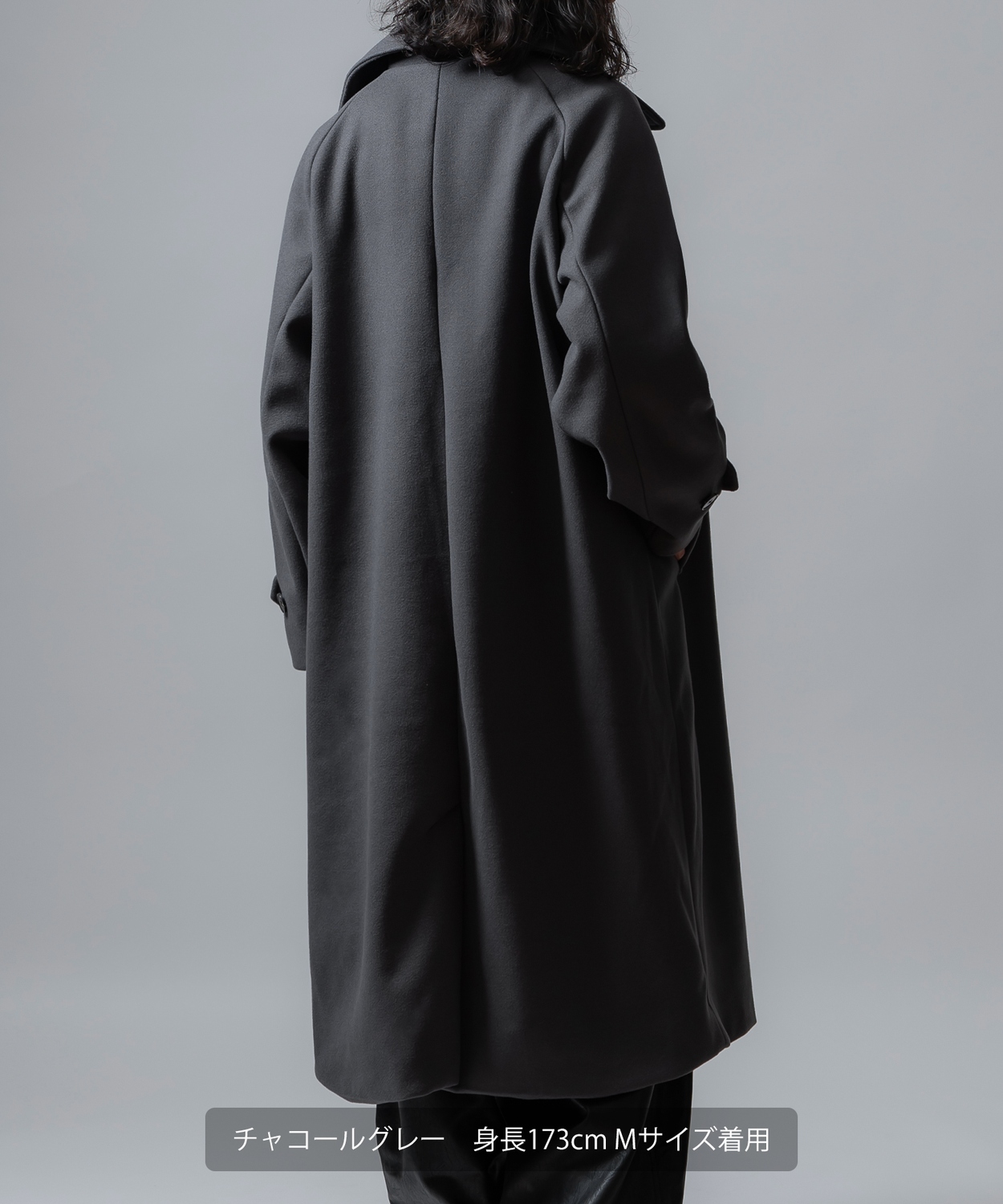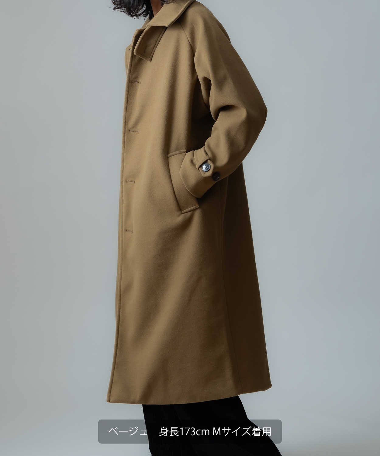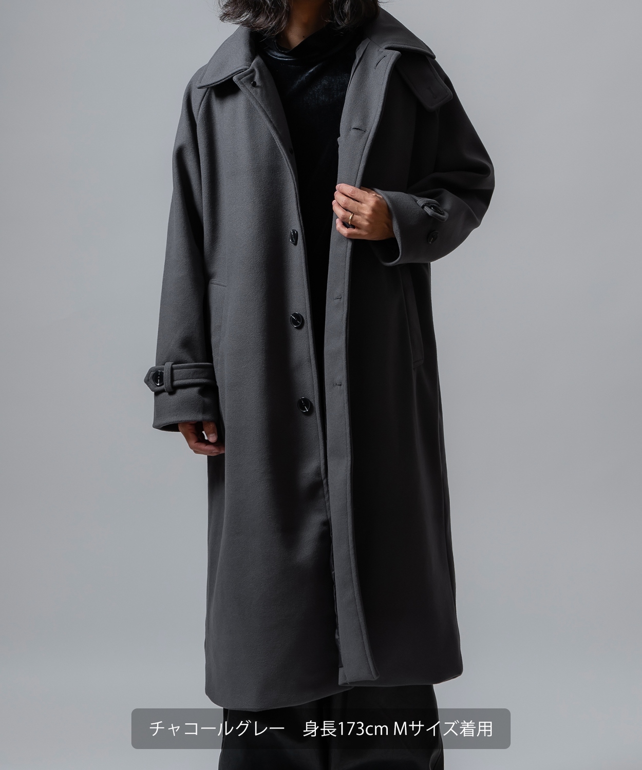 襟を立てたスタンドカラーはモードで都会的な防寒スタイルに。