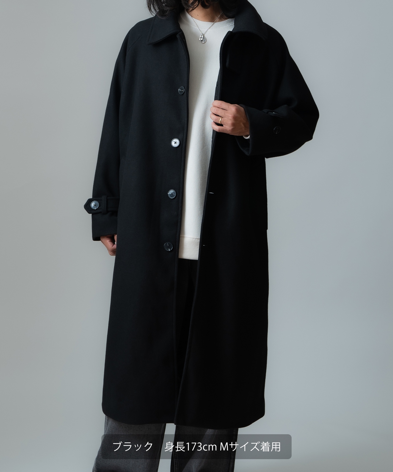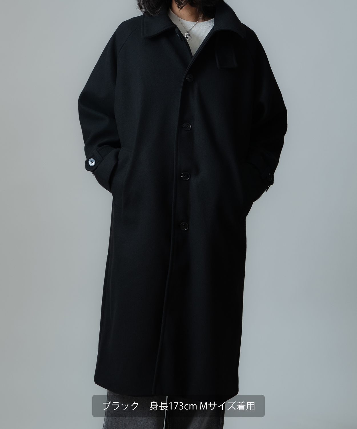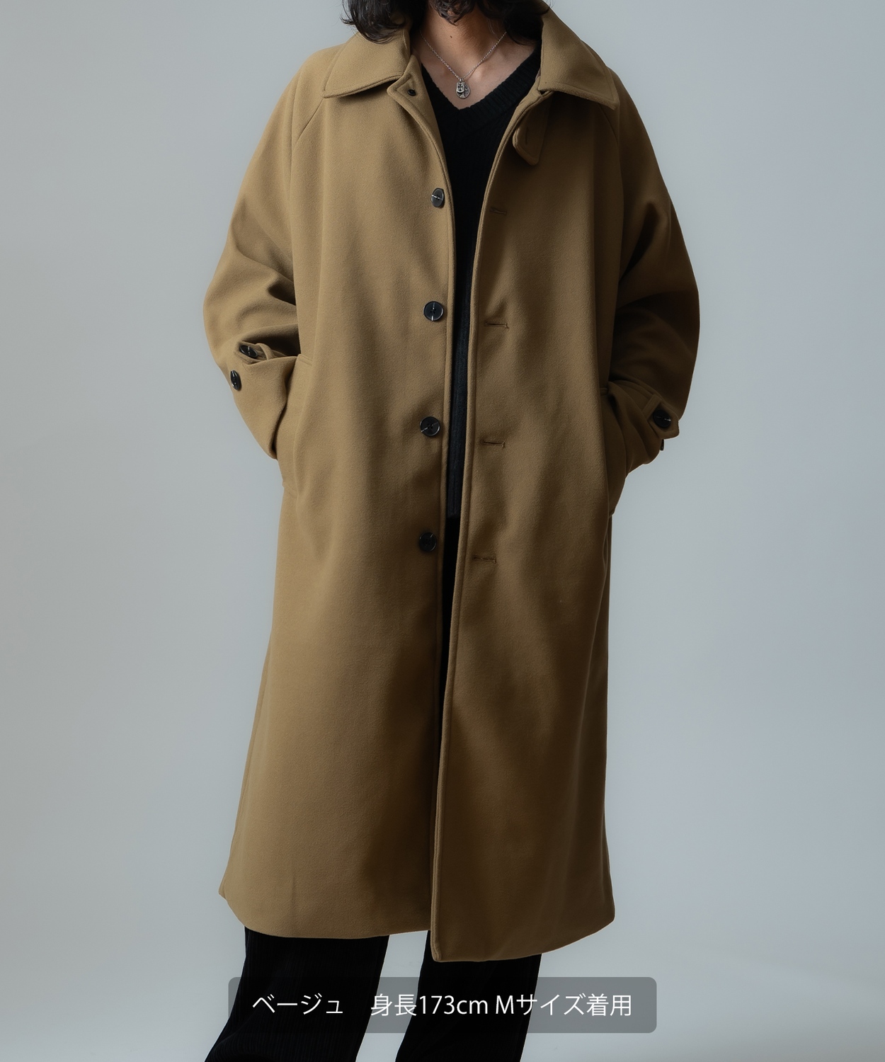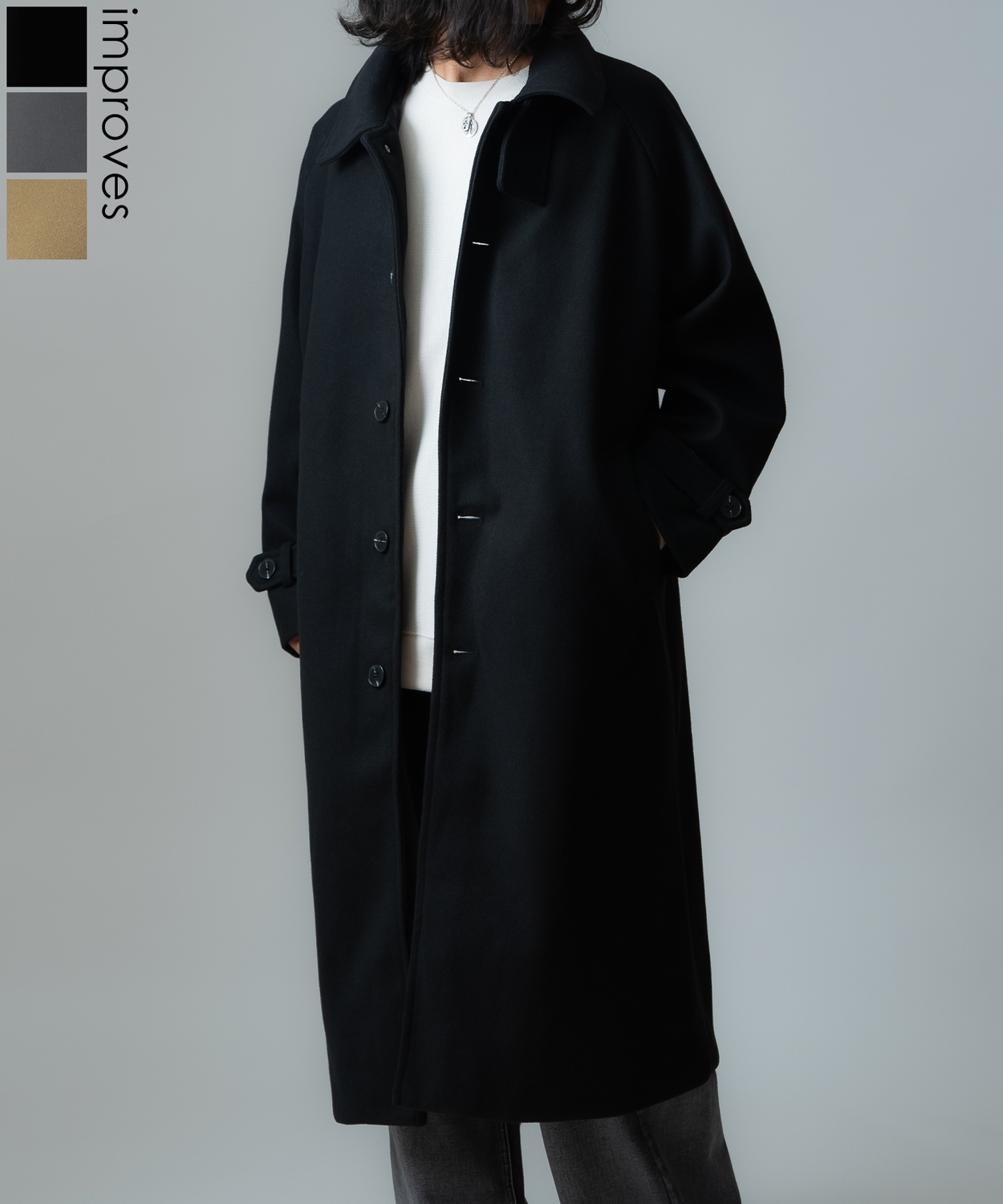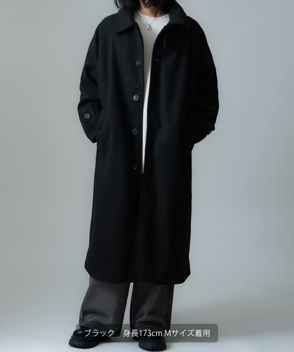 襟を立てたスタンドカラーはモードで都会的な防寒スタイルに。